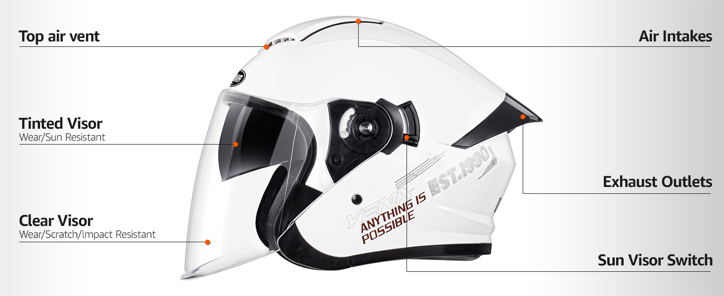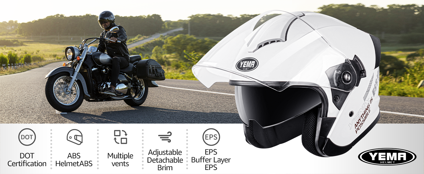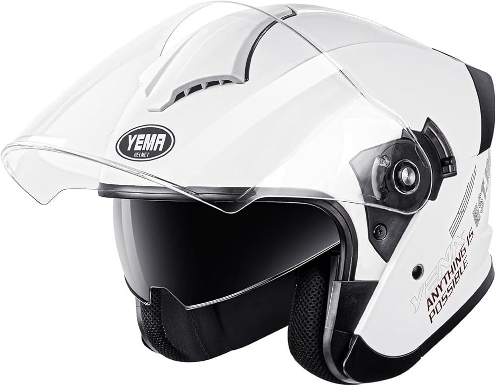 【خوذة وجه مفتوحة 3/4 مزدوجة】تجمع خوذة الدراجة النارية المعتمدة من YEMA DOT بين حاجب خارجي شفاف لحماية الرياح ورؤية واسعة، مع حاجب داخلي من الشمس المدخن يحجب 104% من الأشعة فوق البنفسجية - لا حاجة للنظارات الشمسية أو تبديل العدسات. مثالية لدراجات الشوارع والدراجات البخارية والدراجات البخارية