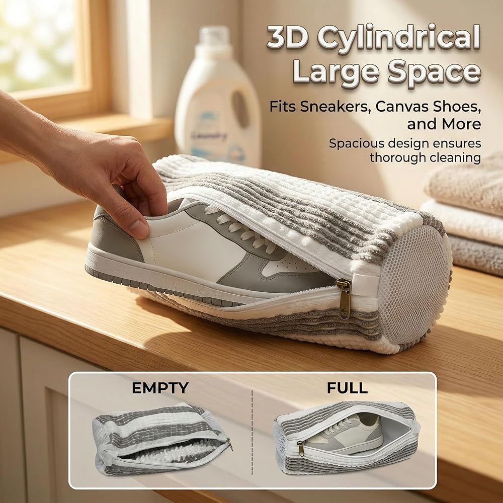 【High-Quality Materials】This laundry shoe bag for washer and dryer is made of composite structure fabric of sandwich mesh and fluffy fibers.Its high breathability allows water and soap solution to penetrate easily, ensures a full, gentle cleaning experience in your washer.Durable and reusable, this shoe bag for washing machine is a must-have for every household.