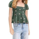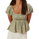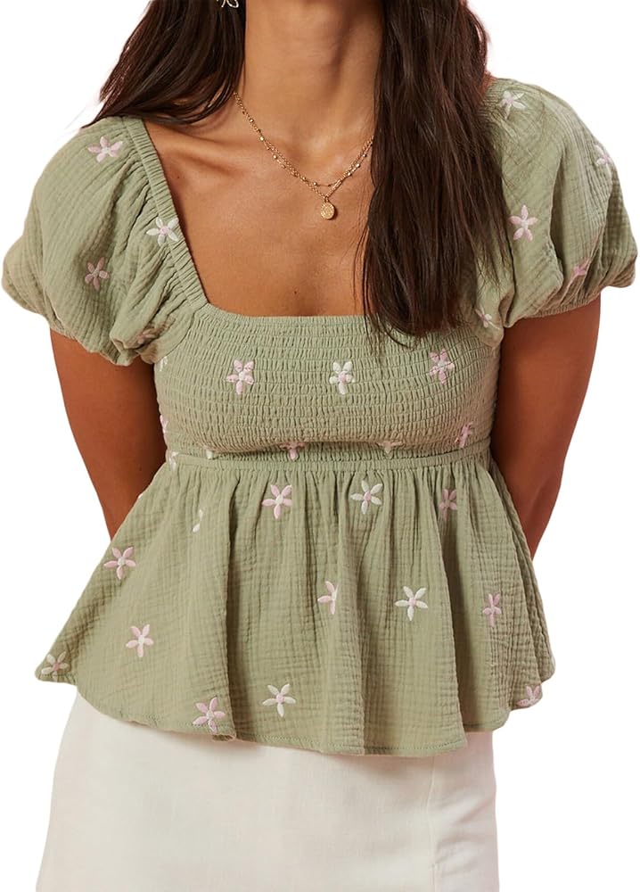 The women square neck top features ballon sleeve and ruffles hemline, decorated with floral embroidery and ruched details, flattering your bodyline and making you more charming