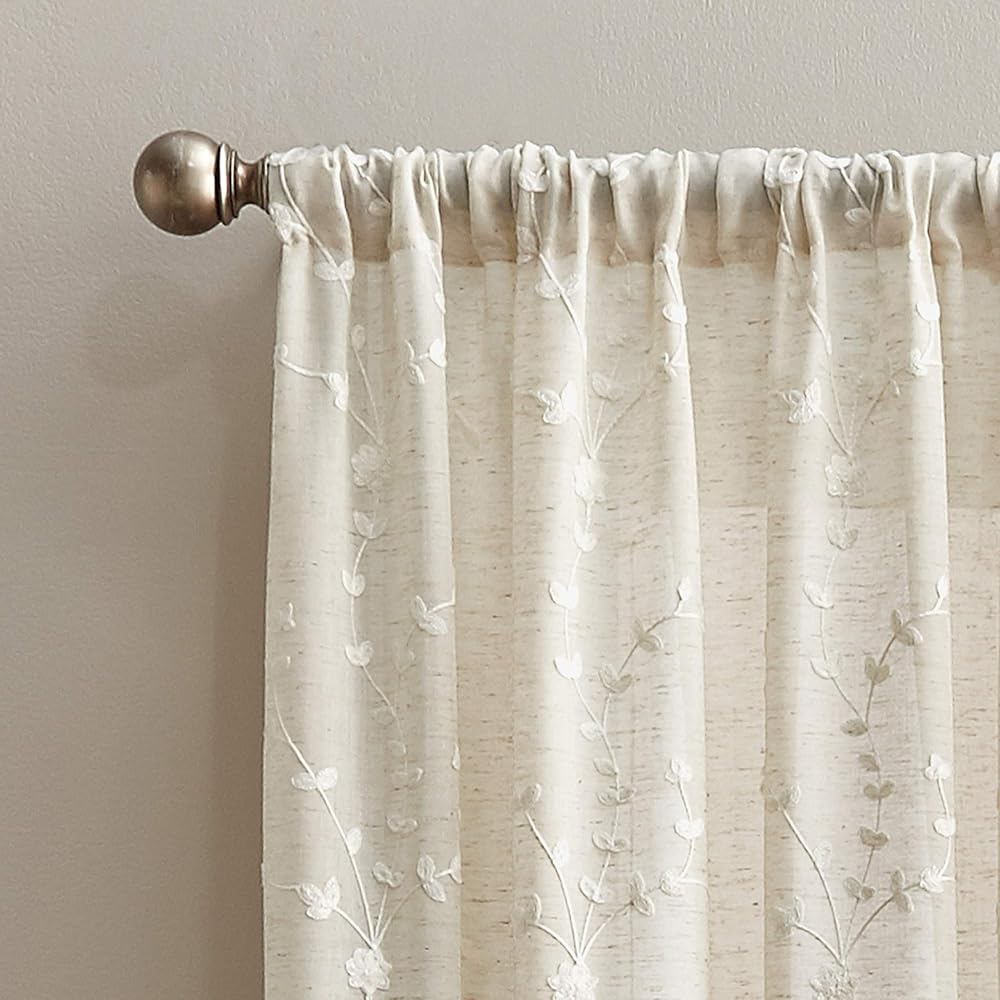 Delicate, detailed embroidered flowers highlight this striking casual window panel! Window panel features an allover design of lovely floral embroidery on a natural linen ground. Panel features a wide, three-inch rod pocket to accommodate either a standard or decorative drapery rod. Single, wide-width panel measures a generous 50 inches wide. Panel is sold individually.