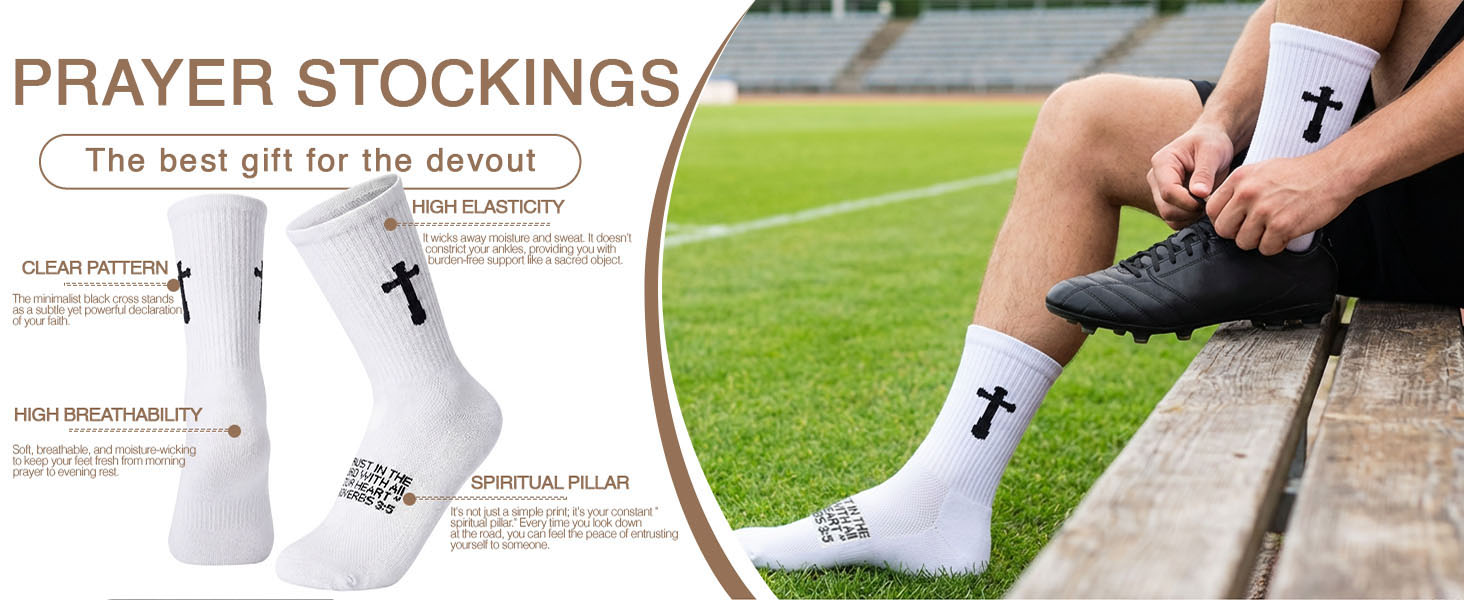 • تم تصميم جوارب الصلاة هذه خصيصًا للمسيحيين. يعد الصليب الموجود على الكفة وآيات الكتاب المقدس الموجودة على مشط القدم من الرموز المميزة للمسيحية. إنها مناسبة للارتداء اليومي وللمناسبات المسيحية المختلفة مثل عيد الفصح وعيد الميلاد