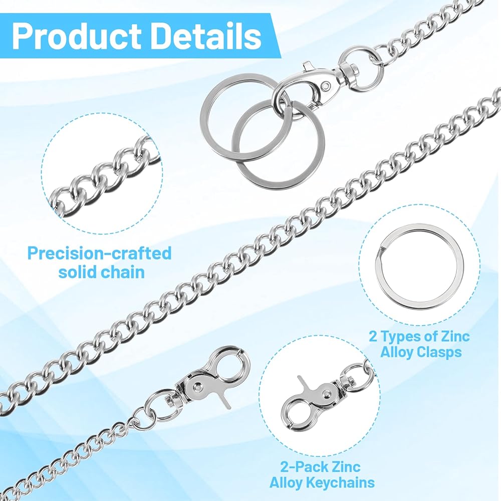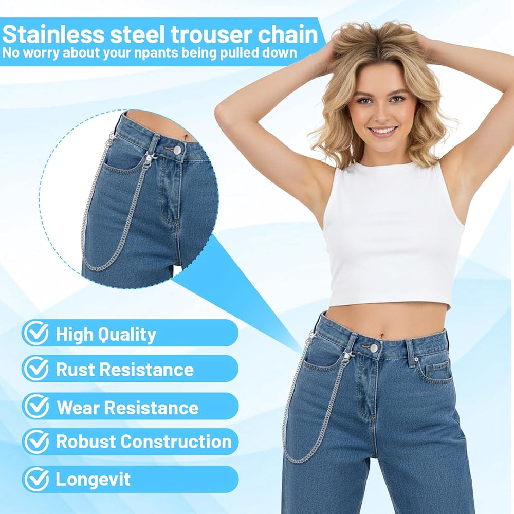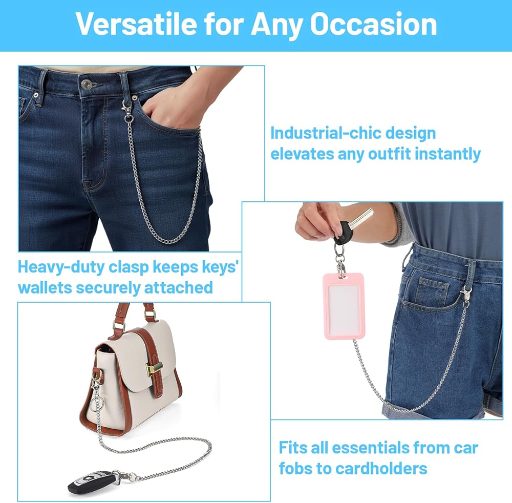 • Unisex Accessory: A sophisticated silver belt chain that perfectly complements a variety of styles. This jean chain is a favorite among motorcycle enthusiasts, punk rock fans, metal lovers and streetwear enthusiasts. Whether paired with jeans, a leather jacket or a bag, this pocket chain adds a touch of personality to your concert, bike ride or everyday outfits.