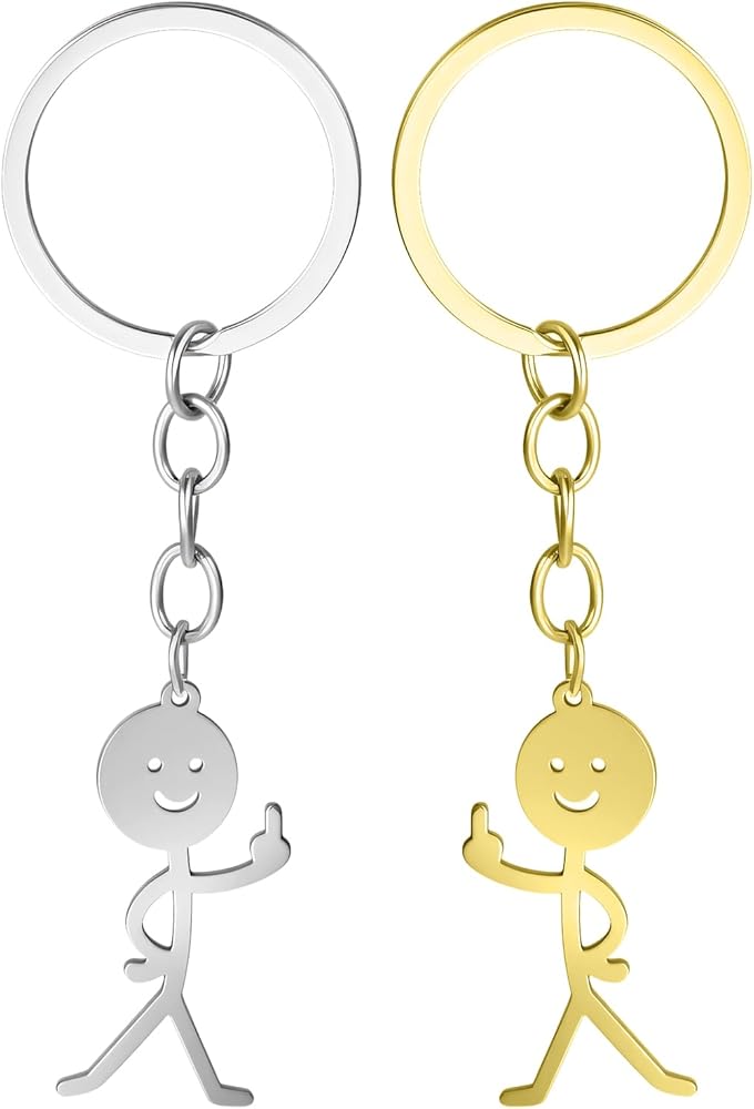 Ouligay 2 قطعة سلسلة مفاتيح مضحكة للنساء، هدايا الأصابع الوسطى، حلقة مفاتيح Stickman، هدايا رائعة للرجال، سلاسل مفاتيح متطابقة، هدية شخصية للصداقة عن بعد للأزواج والأصدقاء والأخوة (الذهب الفضي)
