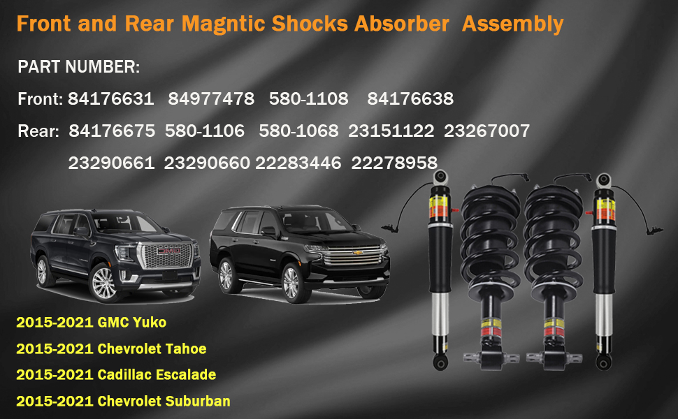 🚗【المركبات المتوافقة】تتوافق ممتصات الصدمات المغناطيسية للتحكم في الركوب مع الموديلات التالية: كاديلاك إسكاليد 2015-2021، كاديلاك إسكاليد ESV 2015-2021، شيفروليه سيلفرادو 2015-2021، سوبربان 2015-2021، تاهو 2015-2021، جي إم سي سييرا 1500 2015-2021، يوكون 2015-2021، يوكون XL 2015-2021.