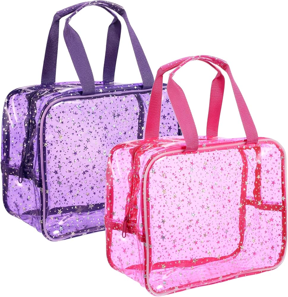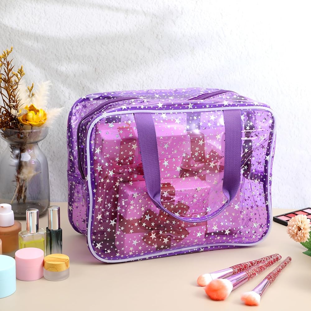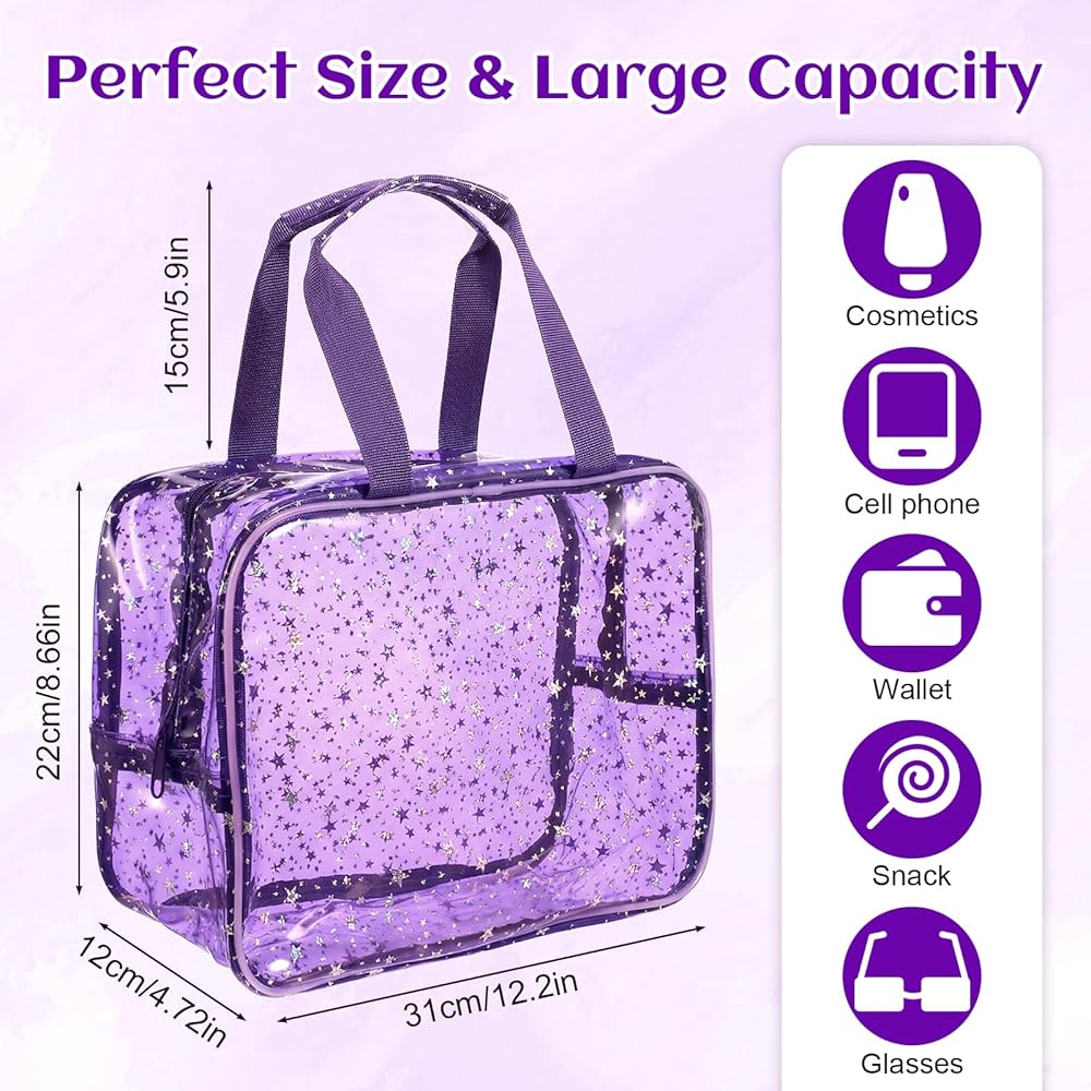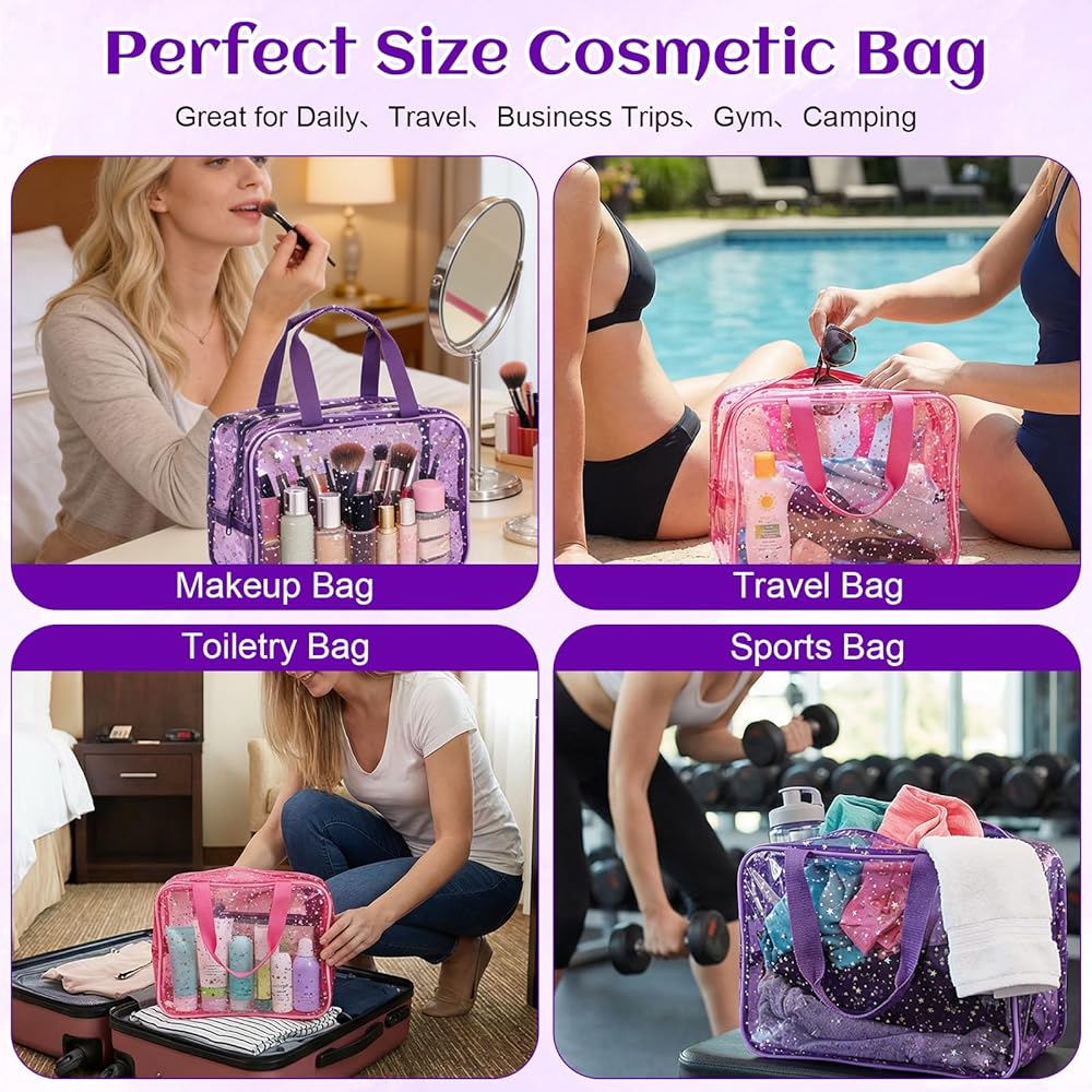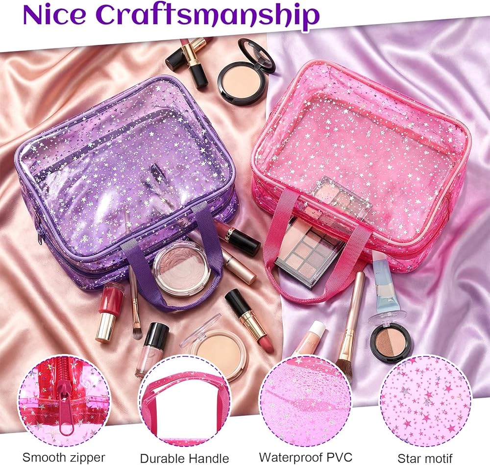 Package Contents: You will receive 2 clear makeup bags. Our clear cosmetic bags with zipper come in two colors: purple and pink—one of each color. Our big makeup bag has a star pattern, and the overall shape is very beautiful, which is very suitable for use as a cosmetic bag or storage bag,you can use them yourself or share with family and friends