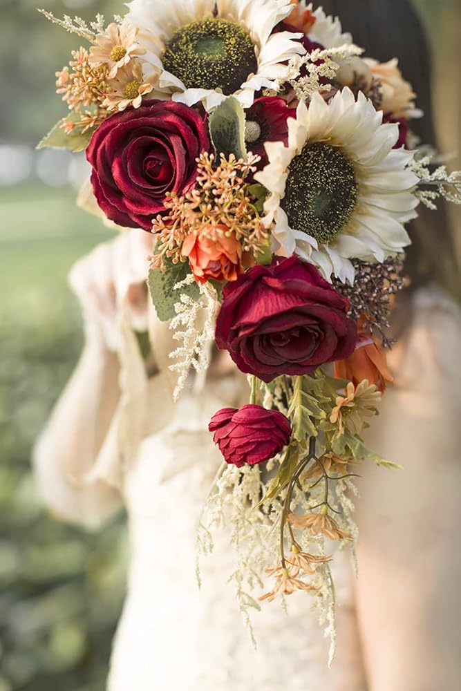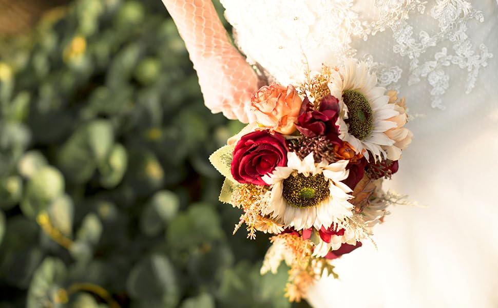 اعتقدت أنها كانت باقة زهور مجففة: الزهور الرئيسية في باقة العروس كانت عبارة عن وردة مجففة برتقالية محترقة، وردة بورجوندي وعباد الشمس الأبيض العاجي. تبدو طبيعية جدًا وحيوية، حتى إذا لمستها، فإنها ستصدر صوت حفيف، وهو ما يتوافق مع صوت الزهور المجففة.
