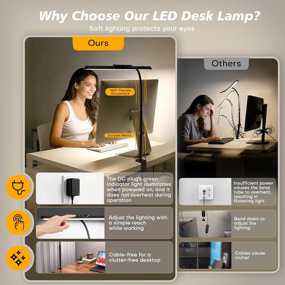 ثبات فائق مع محول تيار مستمر متضمن: على عكس المصابيح القياسية التي تعمل بالطاقة USB والتي غالبًا ما تعاني من الإضاءة غير المستقرة وارتفاع درجة الحرارة، فإن مصباح المكتب الخاص بنا المزود بمشبك مجهز بمحول قابس تيار مستمر مخصص. وهذا يوفر أداءً متسقًا وعالي الطاقة لتجربة أكثر سطوعًا وخالية من الوميض. استمتع بإضاءة ثابتة تحمي شاشتك وعينيك أثناء ساعات العمل الممتدة أو جلسات الدراسة المكثفة