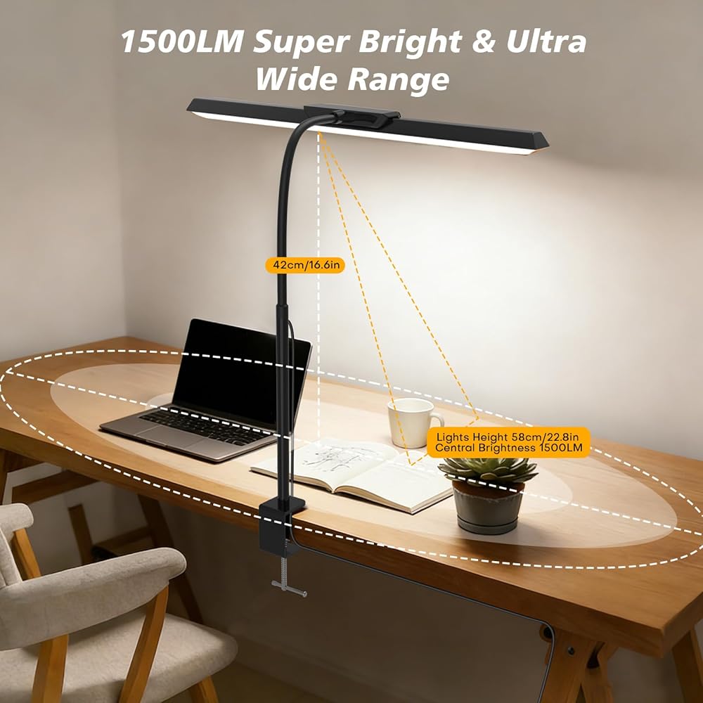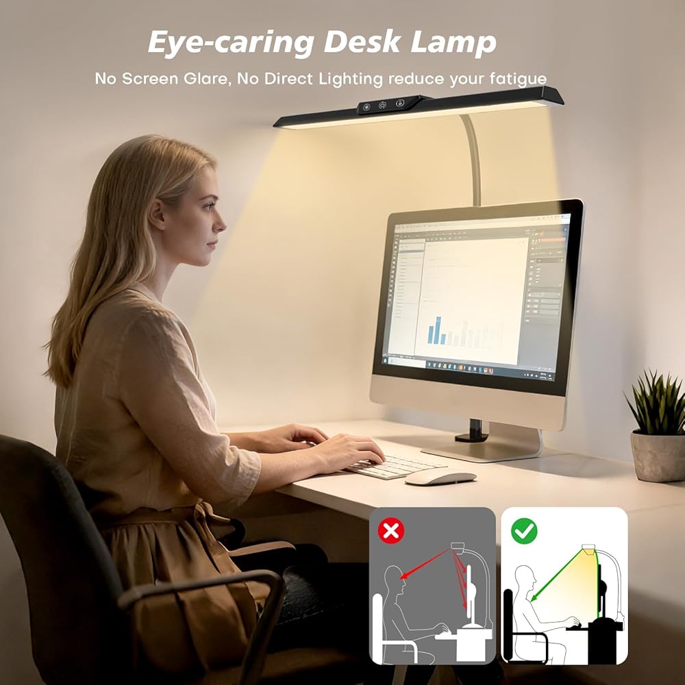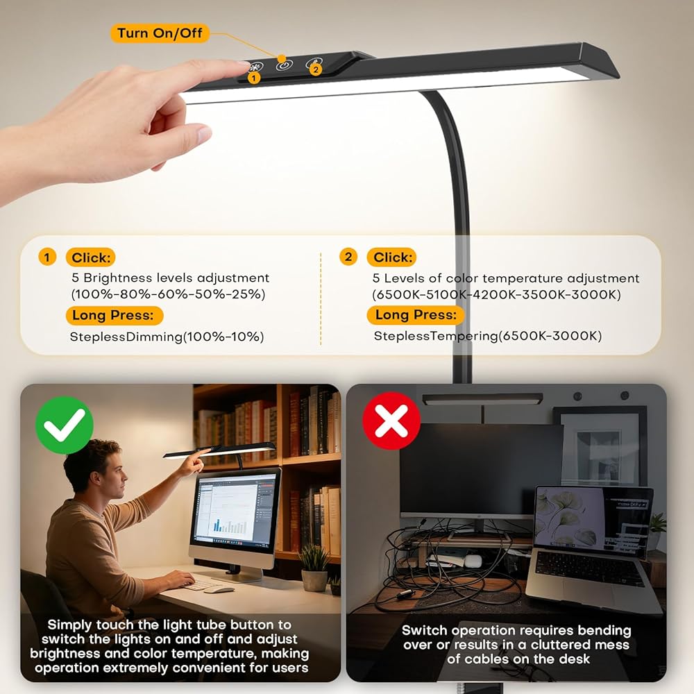 تعتيم بدون خطوات وإضاءة قابلة للتخصيص: قم بتخصيص أجواء مساحة العمل الخاصة بك دون عناء. اختر من بين 5 أوضاع سطوع محددة مسبقًا (100%-1%) ودرجة حرارة اللون (6500K-3000K)، أو ببساطة اضغط لفترة طويلة للحصول على تعتيم سلس وبدون خطوات. سواء كنت بحاجة إلى إضاءة واضحة وباردة لمهام العمل الاحترافية أو إضاءة ناعمة ودافئة للقراءة في وقت متأخر من الليل، فإن مصباح المكتب LED هذا يتكيف مع احتياجاتك البصرية الدقيقة. قم بإنشاء تجربة إضاءة مريحة للقراءة والعمل والدراسة والرسم والحياكة والخياطة والاسترخاء