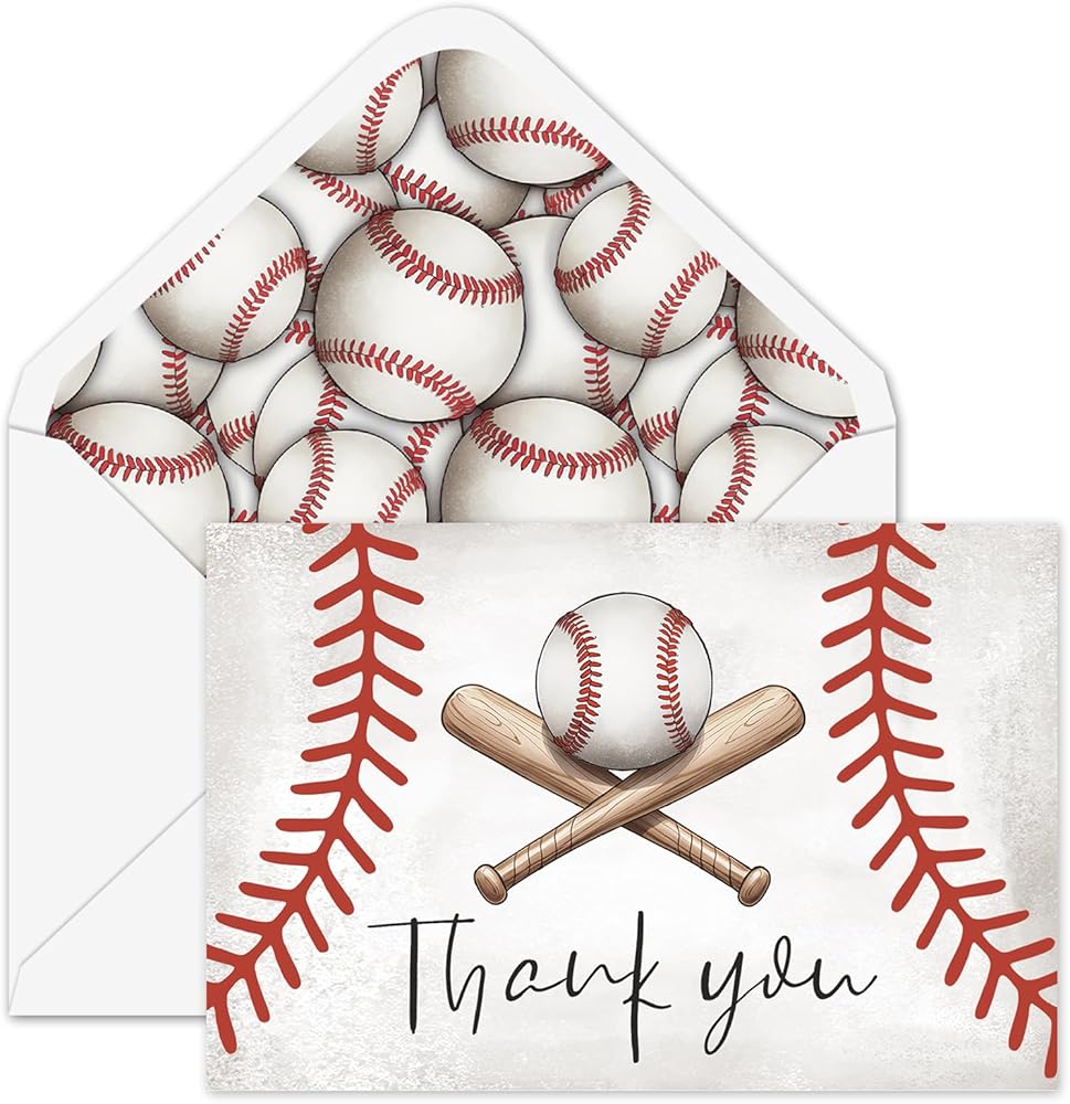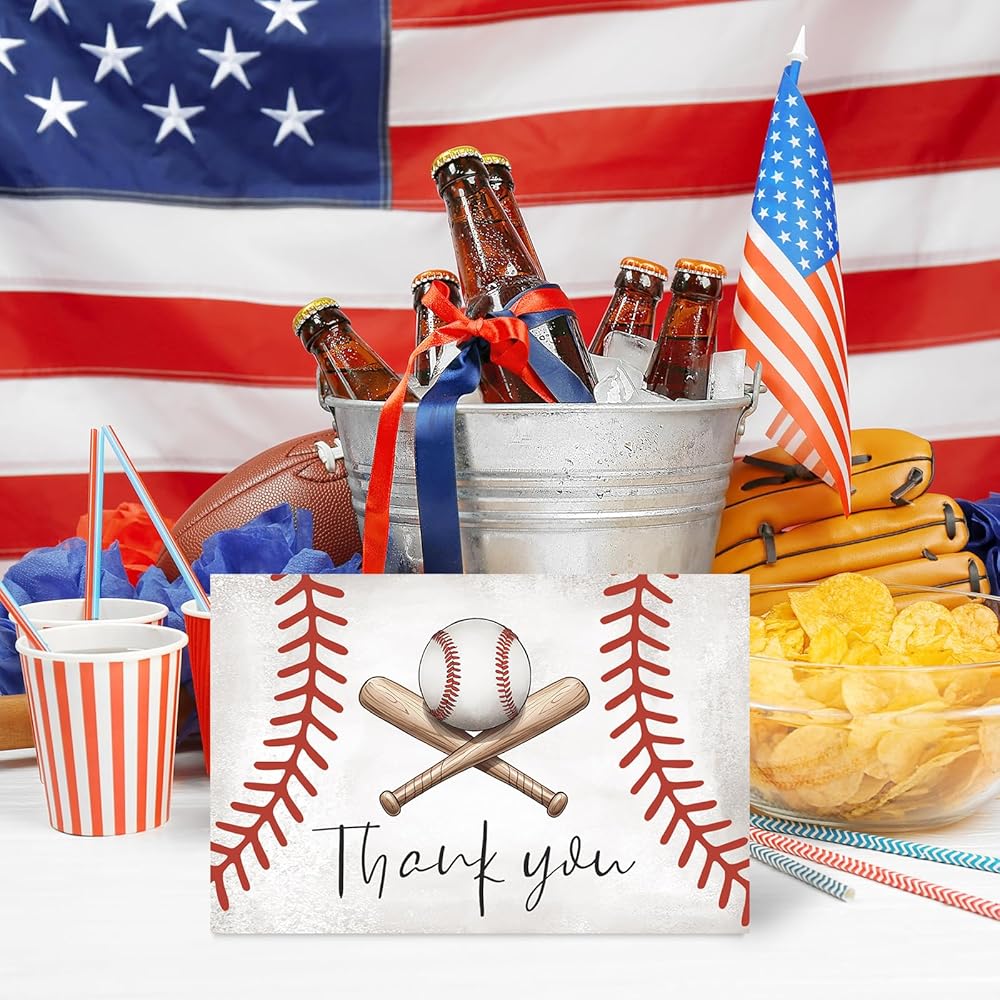 • تصميم البيسبول: تم تصميم بطاقات الشكر الخاصة بنا على شكل البيسبول، ومطبوعة بمضرب البيسبول ومضرب البيسبول، جذابة وعتيقة
