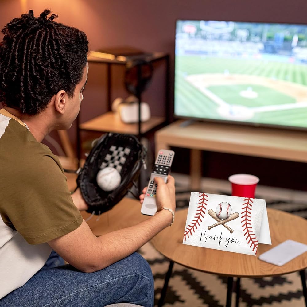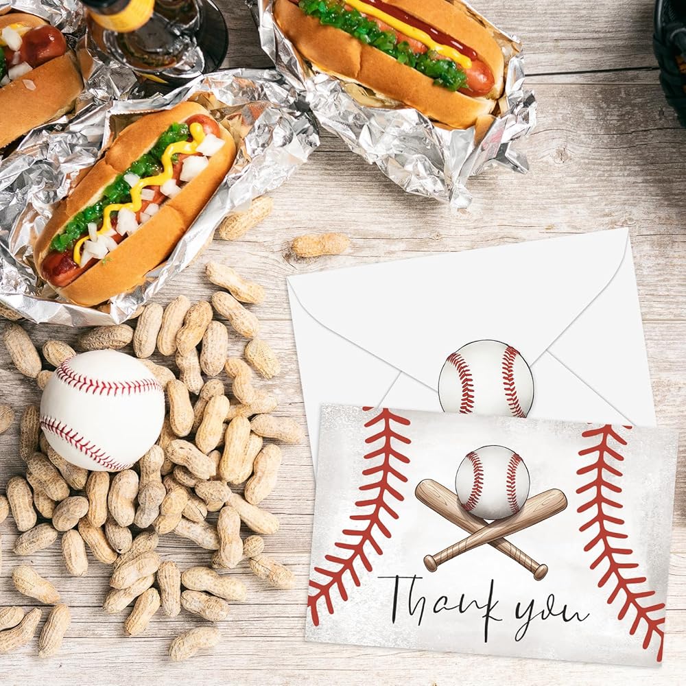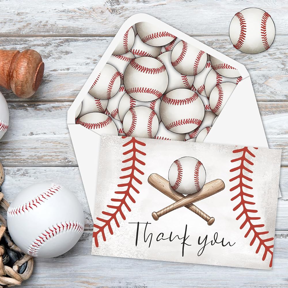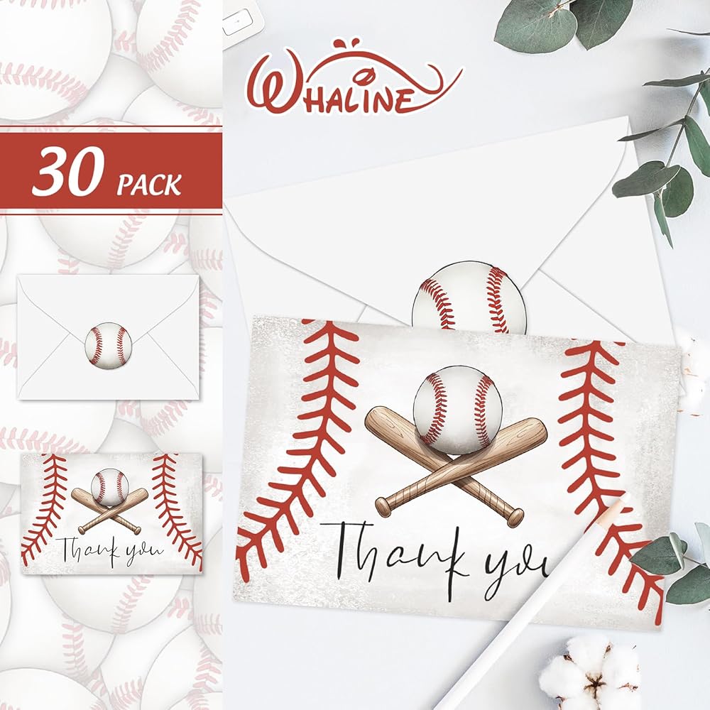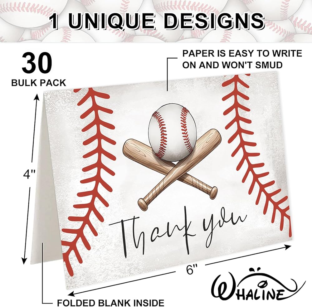 Whaline 30 قطعة من بطاقات البيسبول شكرًا لك، بطاقات المعايدة، بطاقة ملاحظة البيسبول العتيقة مع ملصق مغلف للرياضة، مستلزمات دعوة حفلات أعياد الميلاد، 4 × 6 بوصة