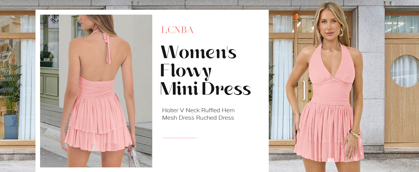 فستان LCNBA نسائي ذو رقبة على شكل حرف V مكشكش وحاشية شبكية، فستان قصير فضفاض مكشكش in Kuwait