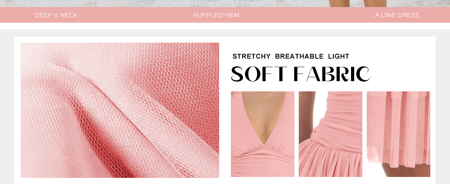 • الميزات - رقبة عميقة على شكل حرف V، بدون أكمام، بدون ظهر، خصر عالٍ بتصميم مكشكش، حاشية فضفاضة مكشكشة، ظهر مفتوح، طول قصير فوق الركبة، فستان على شكل حرف A، فستان كامي قصير، فستان متزلج متأرجح، حاشية مكشكشة