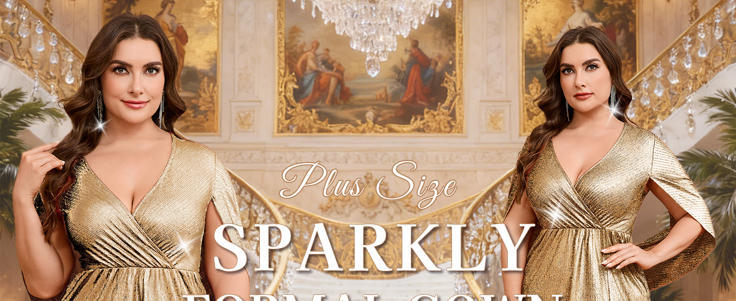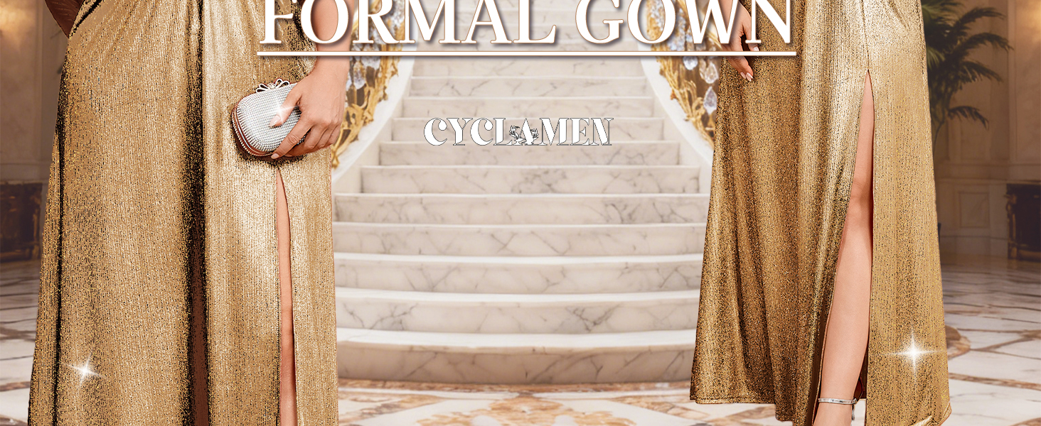 فستان CYCLAMEN طويل رسمي لامع بمقاس كبير وأكمام على شكل حرف V وفتحة جانبية وحفلات الكوكتيل وحفلات الزفاف وحفلات السهرة، ذهبي وأسود، 3X