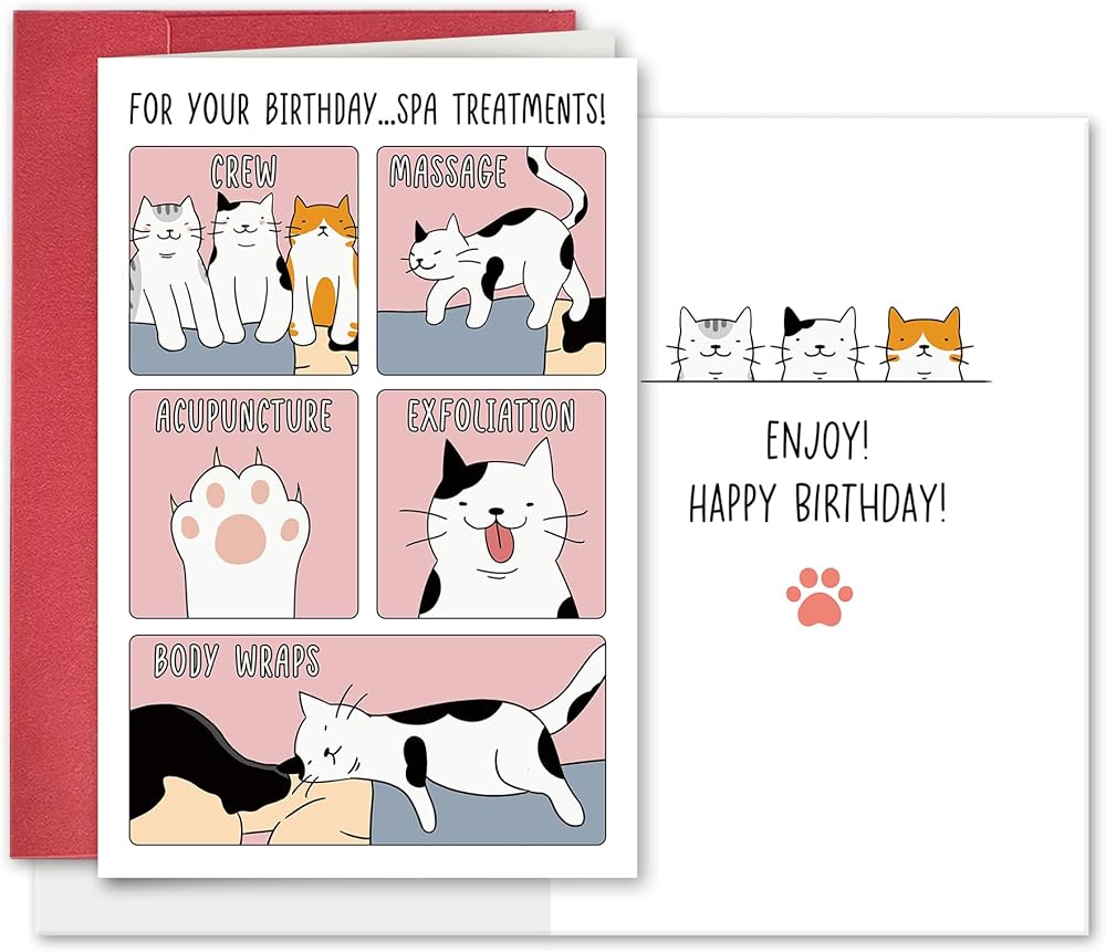 اجعل الجميع يضحكون مع بطاقة عيد الميلاد المرحة هذه! ويضم مجموعة من القطط الرائعة التي تتمتع بعلاج سبا كامل - بدءًا من التدليك والوخز بالإبر وحتى التقشير ولفائف الجسم. إنها طريقة فريدة لا تنسى لتهنئة شخص ما بعيد ميلاده السعيد
