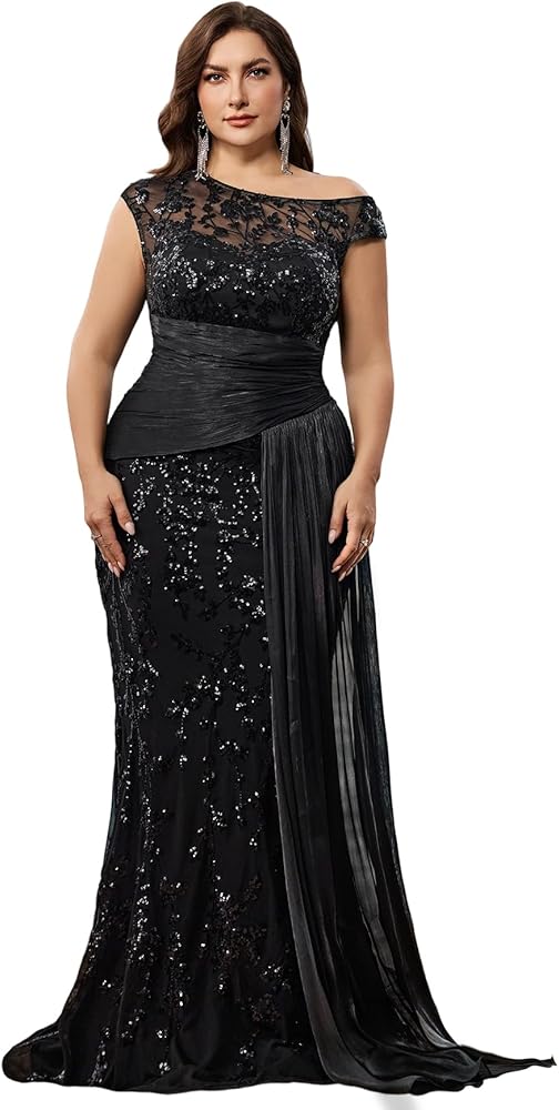احصلي على الصورة الظلية الأكثر جاذبية - يتميز فستان السهرة ذو الحجم الكبير هذا والمعزز للمنحنيات بخط عنق أنيق بدون أكتاف مع أكمام قصيرة أنيقة وصورة ظلية حورية البحر المذهلة. يزين تطريز الترتر المعقد الصدرية الشبكية الشفافة، التي تتدفق إلى فستان طويل مع كشكش رشيق.