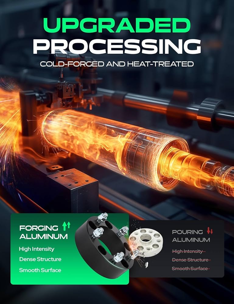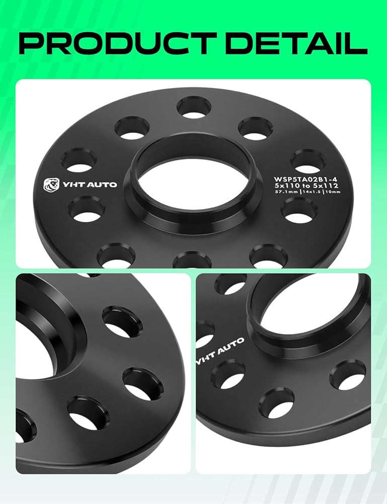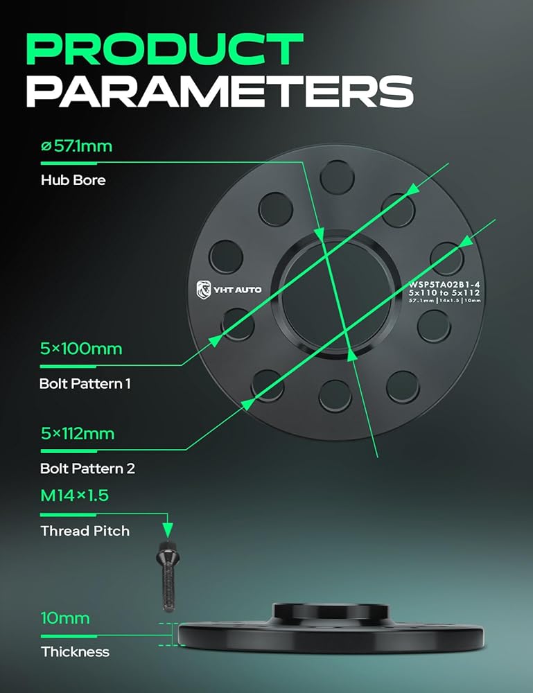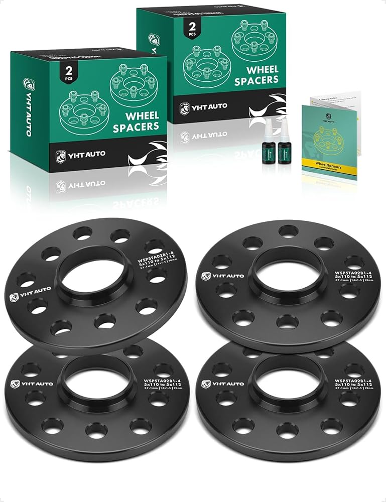 حول فواصل الإطارات: يجب أن يتطابق نمط مسمار السيارة مقاس 5 × 100 مم، ونمط مسمار العجلة مقاس 5 × 112 مم، وتجويف المحور 57.1 مم | سُمك 10 مم، وهذا أيضًا هو الحجم الذي سيتم عنده دفع العجلات للخارج | ترصيع وصواميل M14x1.5| عزم الدوران الموصى به: 85-90 قدم/رطل | مسامير درجة 12.9، أعلى درجة من قوة المسمار