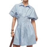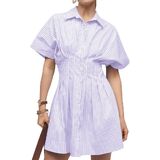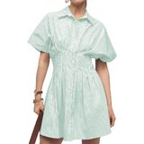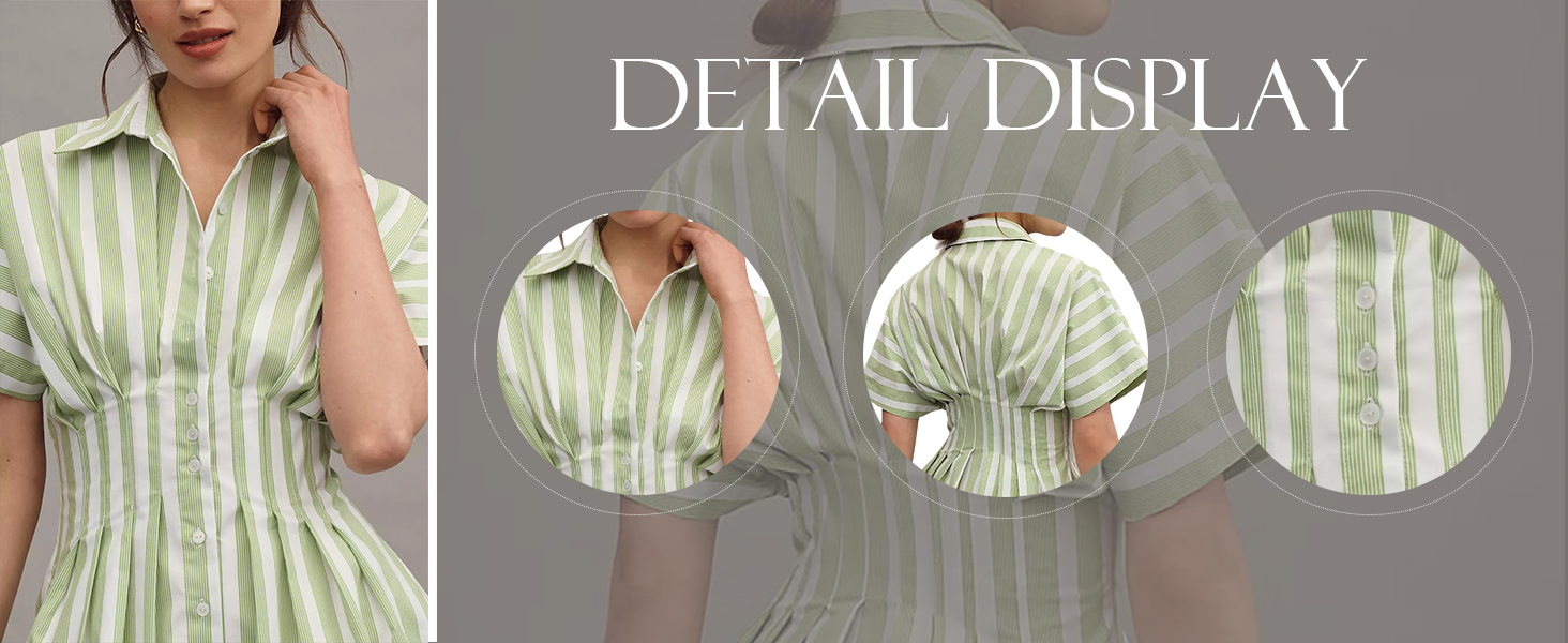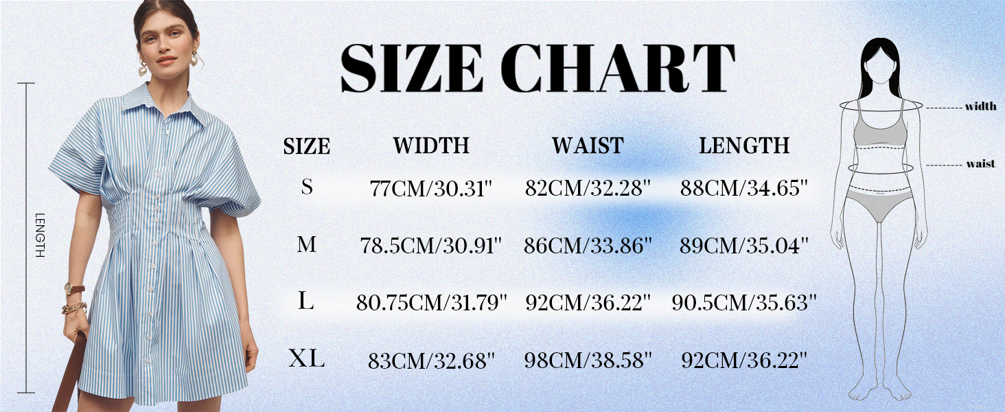 • السمات: فستان قميص توبي الخاص بنا هو في قمة أذهان الجميع، بياقة كلاسيكية، وأكمام كبيرة، وأنماط مخططة وألوان ثابتة، وقصة فضفاضة، وطول صغير وطيات تحدد الخصر.