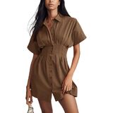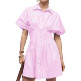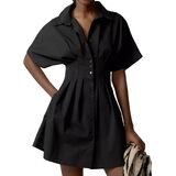 فستان نسائي بأزرار أمامية بطيات، فستان صيفي كاجوال بأكمام قصيرة، بلوزة بطيات، فستان قصير in Kuwait