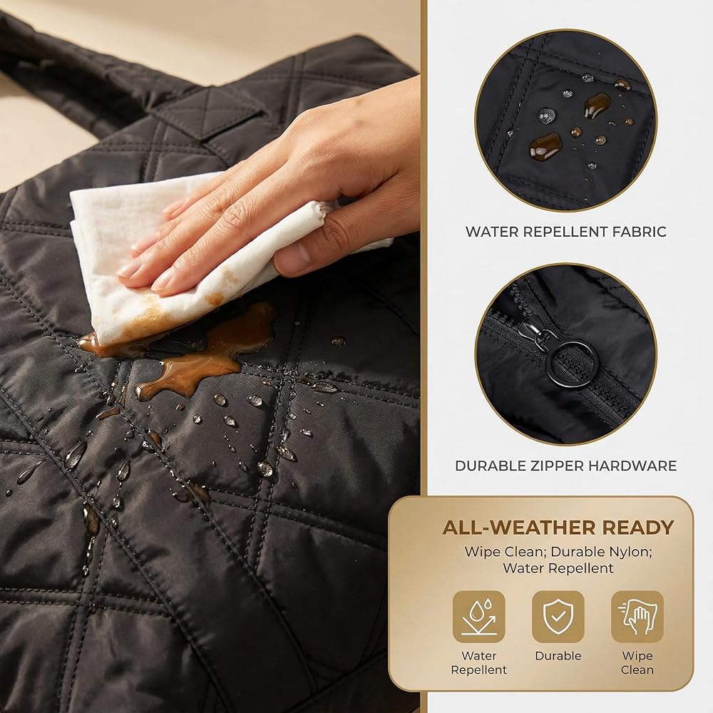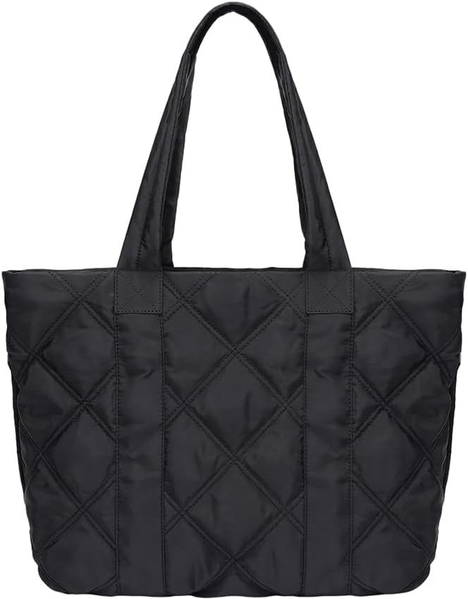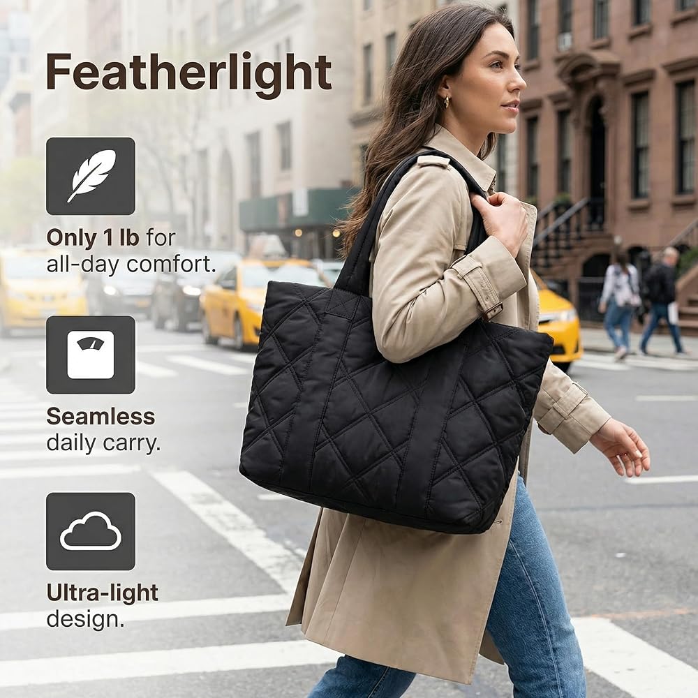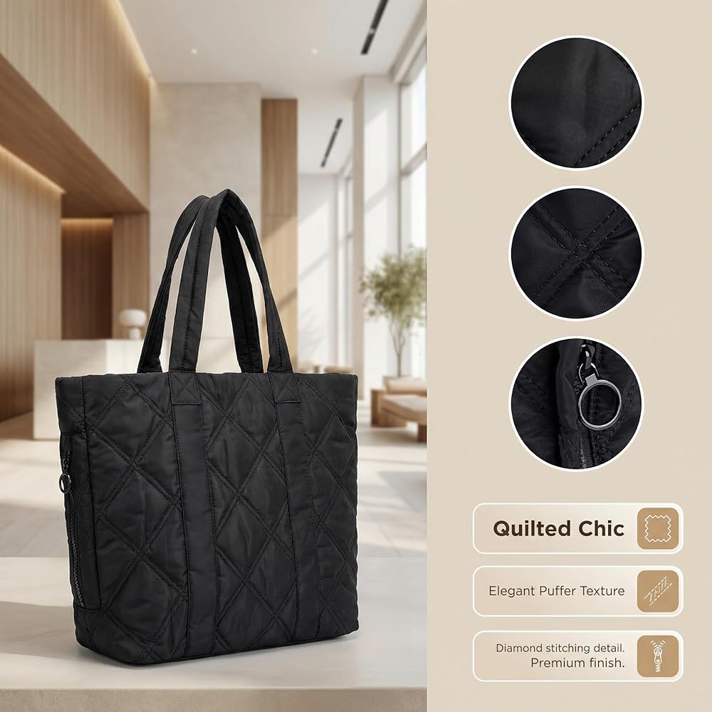 【Light -Stylish Puffer Tote】Weighing just 1 lbs, Measures 13.4" x 5.1" x 11.8"this sleek puffer tote bag for women is your go-to for busy days. The soft yet structured puffer bag fits right into your rhythm(Lightweight, water-resistant, and chic)—whether you're heading to class, the office, or a weekend outing!