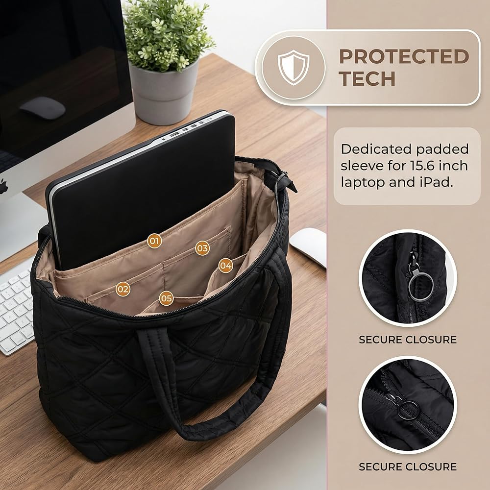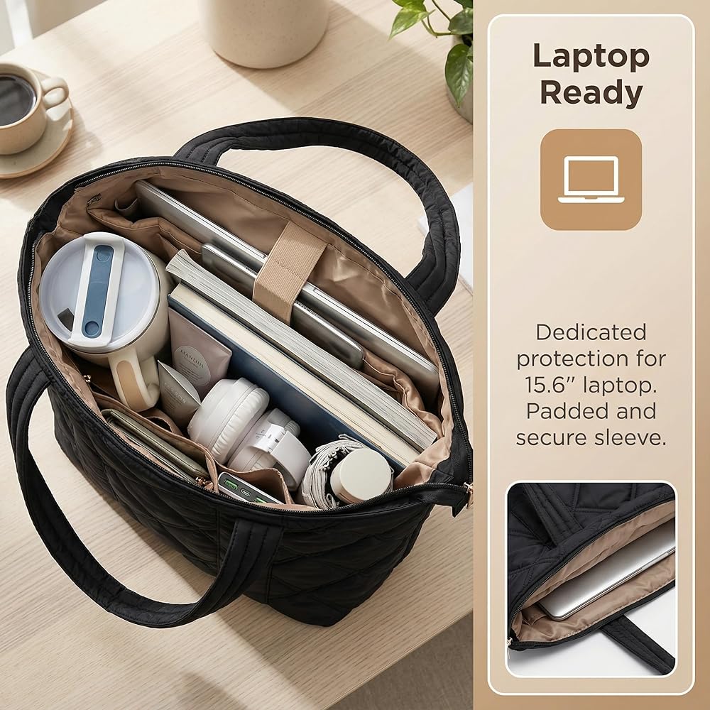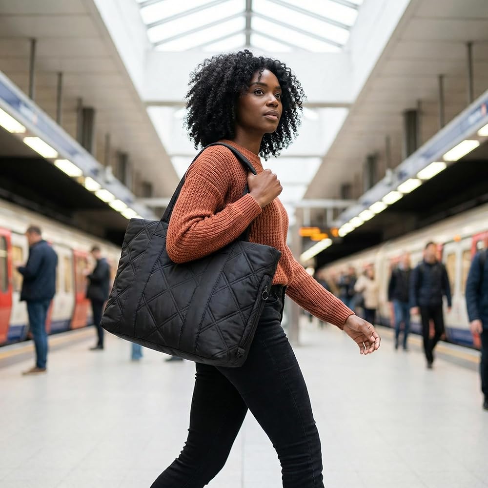【Light -Stylish Puffer Tote】Weighing just 1 lbs, Measures 13.4" x 5.1" x 11.8"this sleek puffer tote bag for women is your go-to for busy days. The soft yet structured puffer bag fits right into your rhythm(Lightweight, water-resistant, and chic)—whether you're heading to class, the office, or a weekend outing!