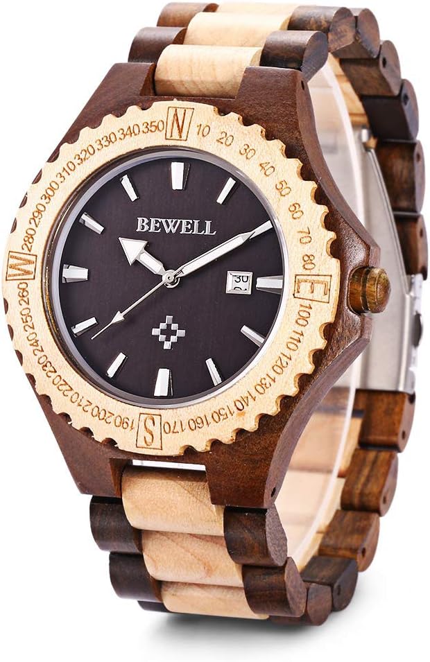 ساعة يد BEWELL ZS-W023A خشبية للرجال بحركة كوارتز خفيفة الوزن مصنوعة يدويًا بتقويم تناظري