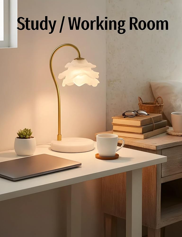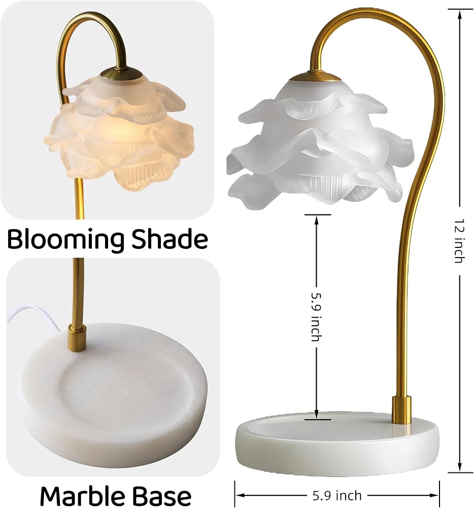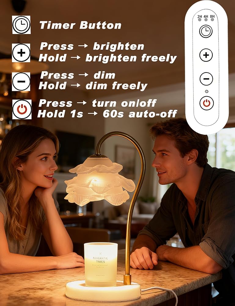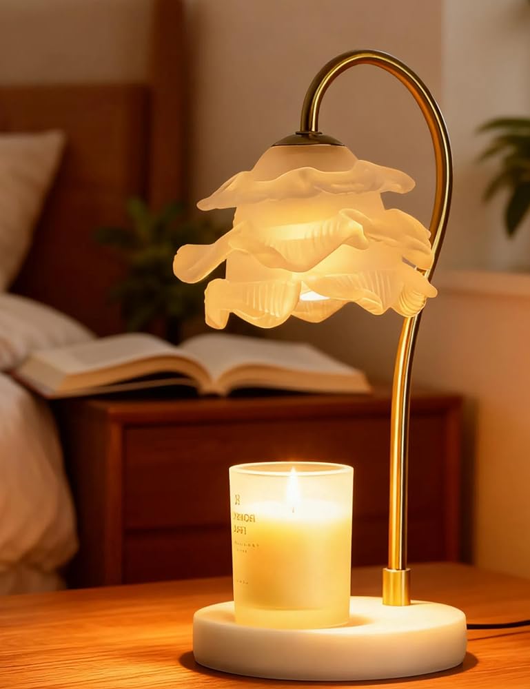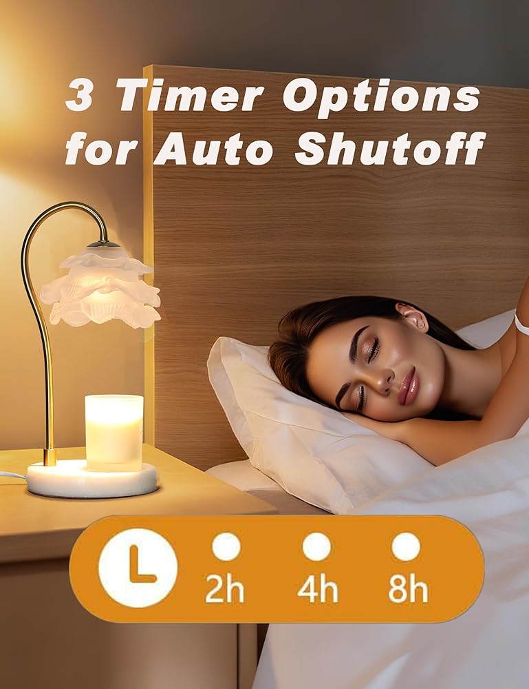 مصباح تدفئة الشموع الرائع مع مؤقت - يتميز مصباح تدفئة الشموع المزود بمؤقت بظل زهرة زجاجي كامل يلفت الرأس - أجزاء متساوية من الديكور والوظيفة. يقوم الزجاج الشفاف والمتين بتوزيع الحرارة حتى لإذابة شموع البرطمان ببطء (بدون دخان/سخام!)، مما يطلق عطرًا يدوم طويلاً مع زيادة المساحة الخاصة بك.