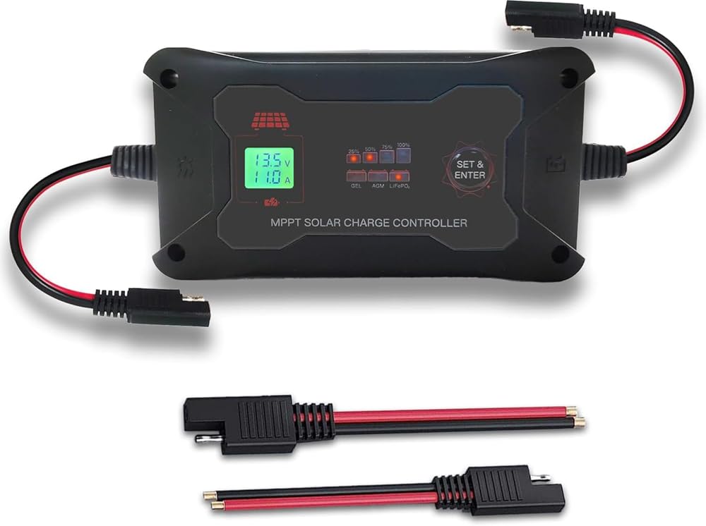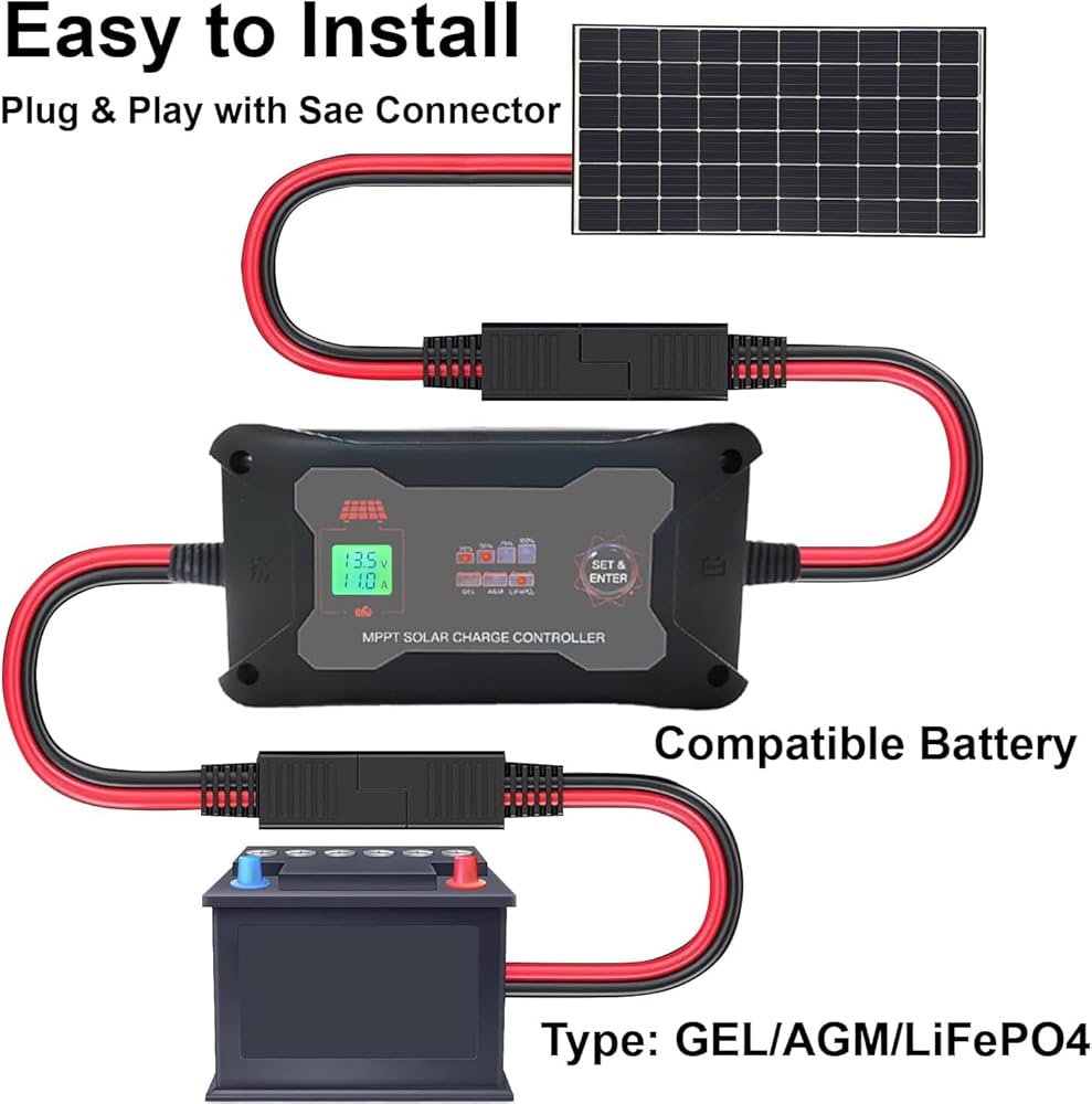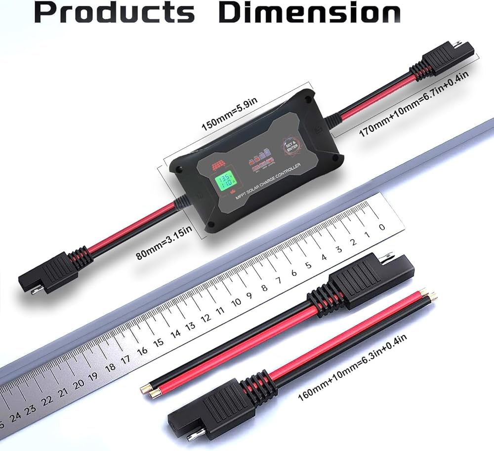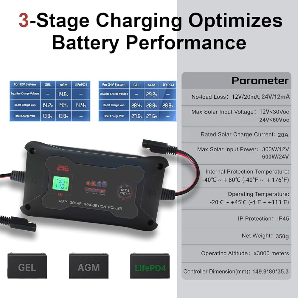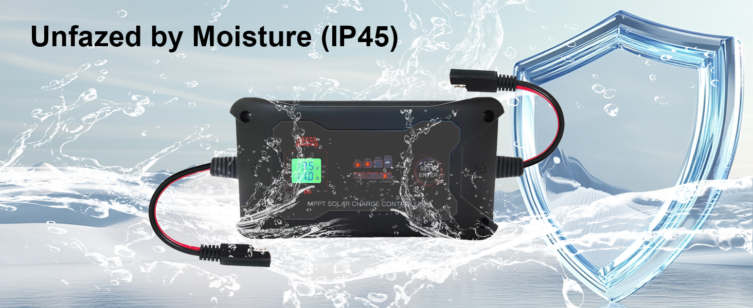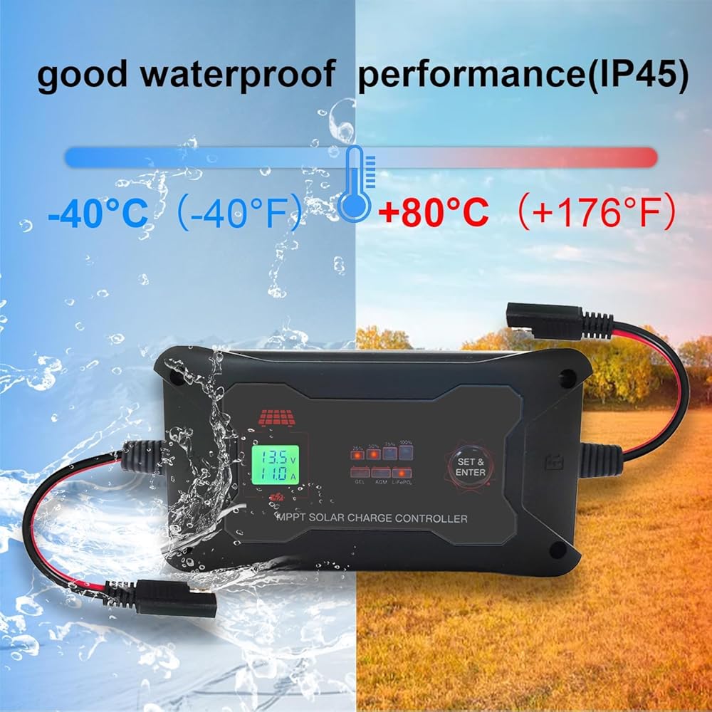 【مراقبة في الوقت الحقيقي وبناء قوي】مجهزة بشاشة LCD وأضواء مؤشر LED، يمكنها مراقبة حالة الألواح الشمسية والبطاريات في الوقت الفعلي. يتميز بجودة ممتازة، ويزن 12.35 أونصة (350 جرامًا) ويتمتع بتصنيف حماية IP45.