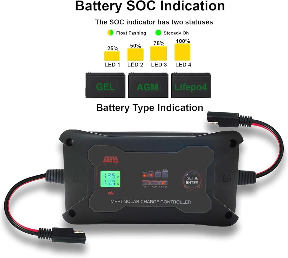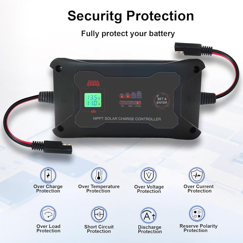【شحن آمن】 وحدة التحكم مجهزة بنظام حماية مدمج وتعتمد شحنًا ذكيًا ثلاثي المراحل (كبير، تعويم، تعزيز). يتميز بحماية مدمجة من الحرارة الزائدة والشحن الزائد والقطبية العكسية، مما يوفر حماية شاملة للبطارية ويضمن تشغيلًا أكثر أمانًا.