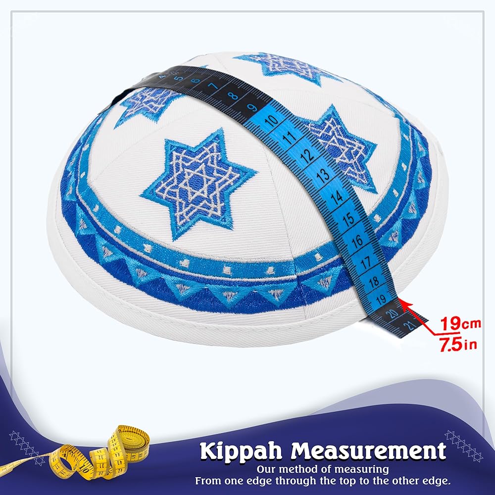 🔯 Precision Fit: With dimensions of 19CM/7.5" when laid flat and 15CM/5.9" edge-to-edge, these kippot offer an ideal fit for adults and children, ensuring comfort and style for all wearers.