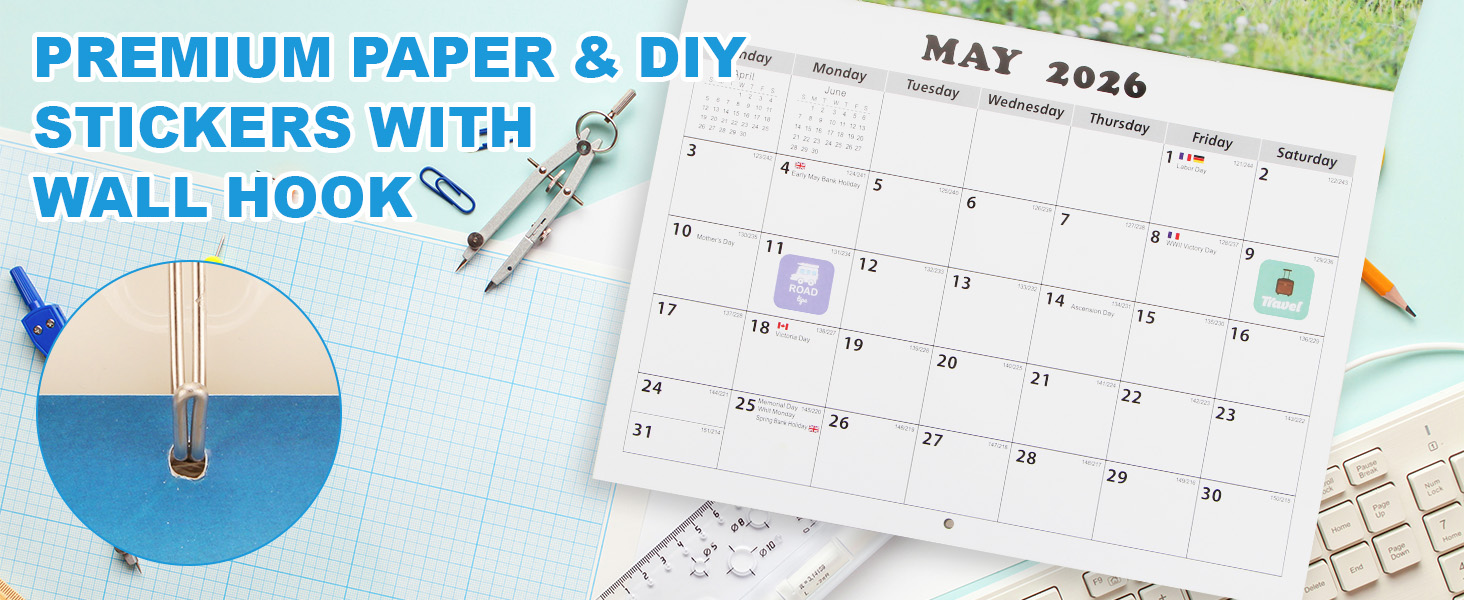 🎁 تقويم حائط 2026 - كامل مع عروات تعليق معززة و4 أوراق ملصقات مزخرفة، تقويم الحائط 2026 هذا لمدة 12 شهرًا يمثل الهدية المثالية. يتميز تقويم التثبيت على الحائط بصفحات مثقوبة سهلة التمزق وورق مطلي ممتاز يتحمل الاستخدام اليومي مع الحفاظ على مظهره الاحترافي.