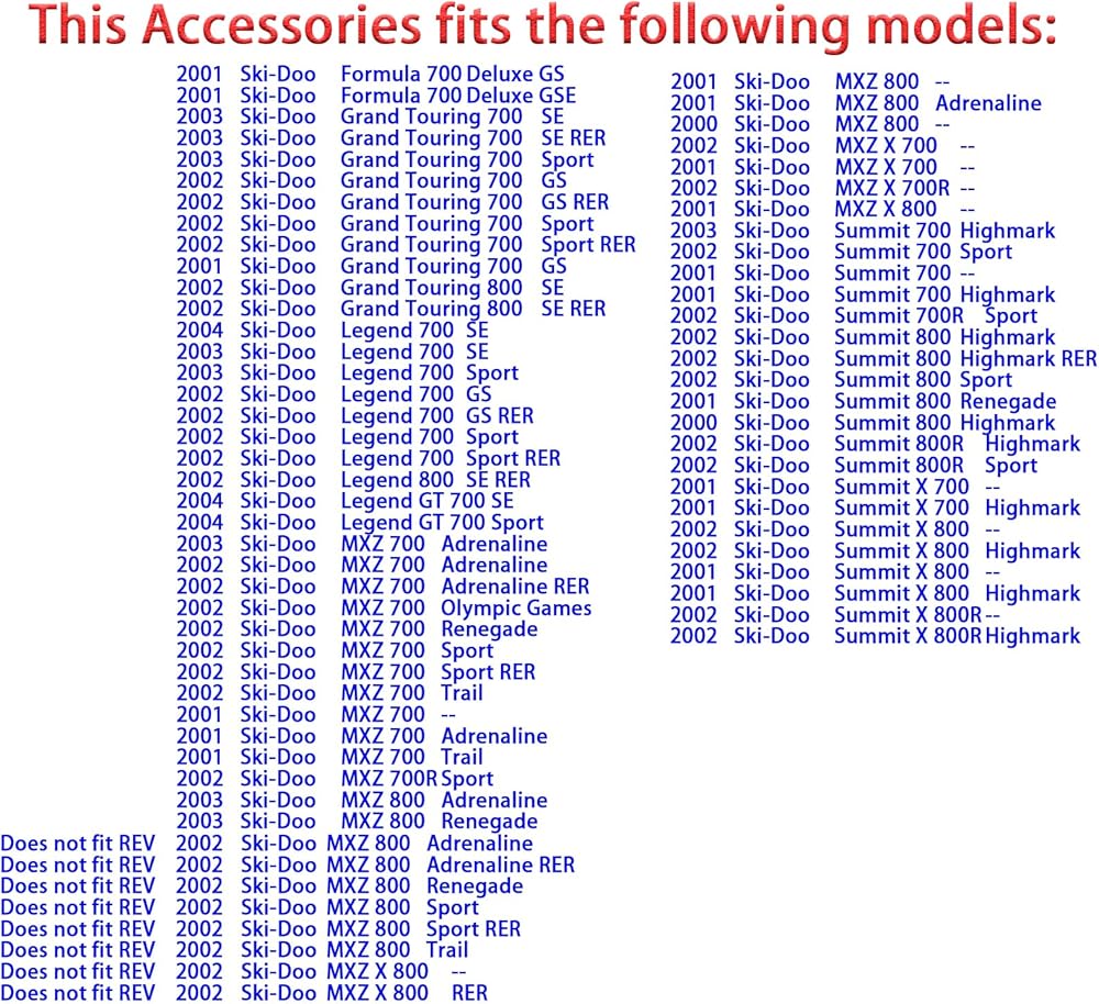 • Compatible Models: For Ski-Doo Formula 700 2001 Grand Touring 700 2001-2003 Grand Touring 800 2002 Legend 700 2002-2004 Legend 800 2002 Legend GT 700 2004 MXZ 700 2001-2003 MXZ 700R 2002 MXZ 800 2000-2003 MXZ X 700 2001-2002 MXZ X 700R 2002 MXZ X 800 2001-2002 Summit 700 2001-2003 Summit 700R 2002 Summit 800 2000-2002 Summit 800R 2002 Summit X 700 2001 Summit X 800 2001-2002 Summit X 800R 2002