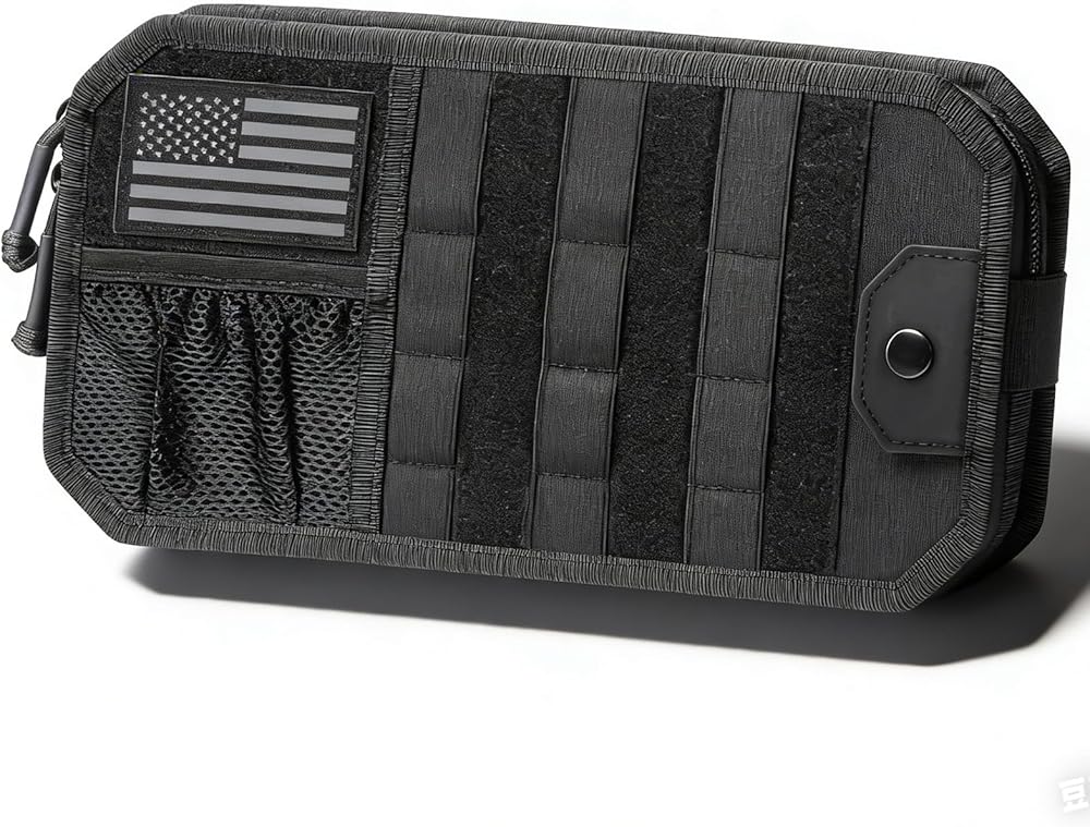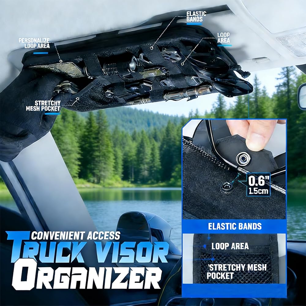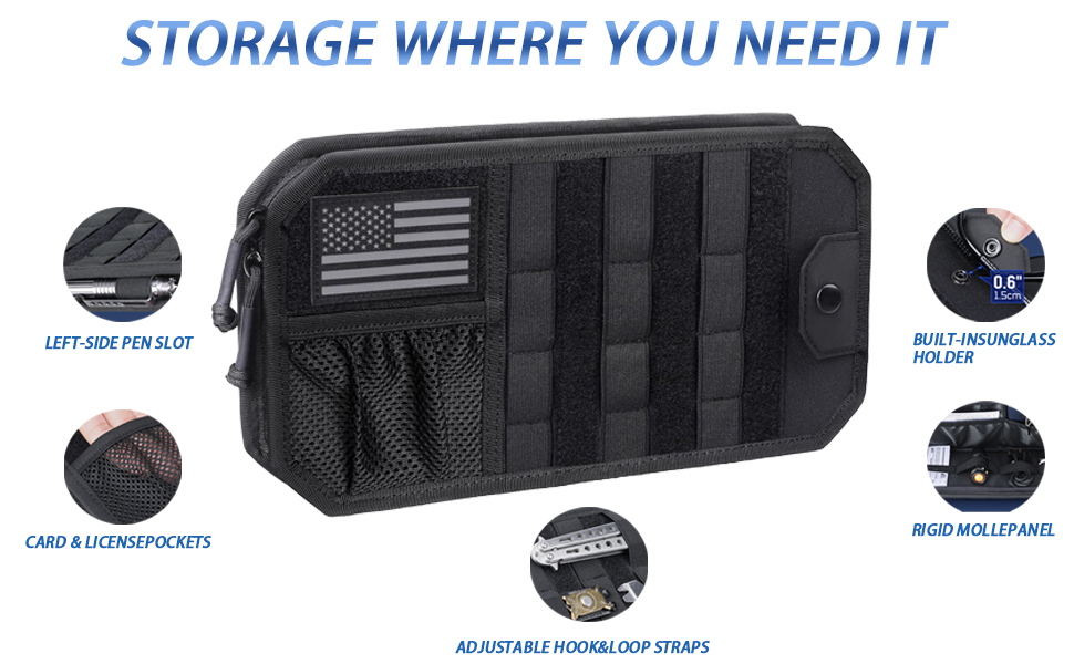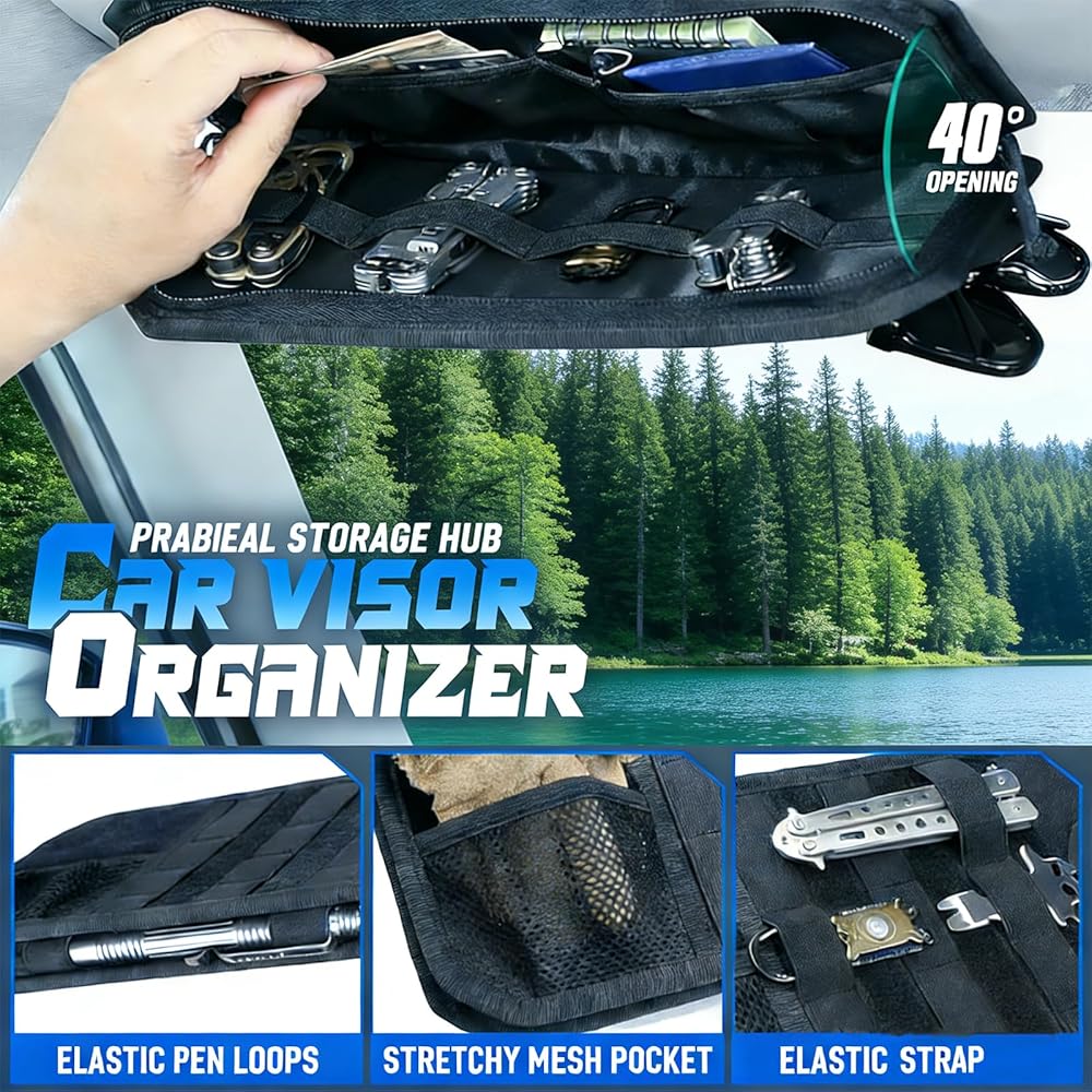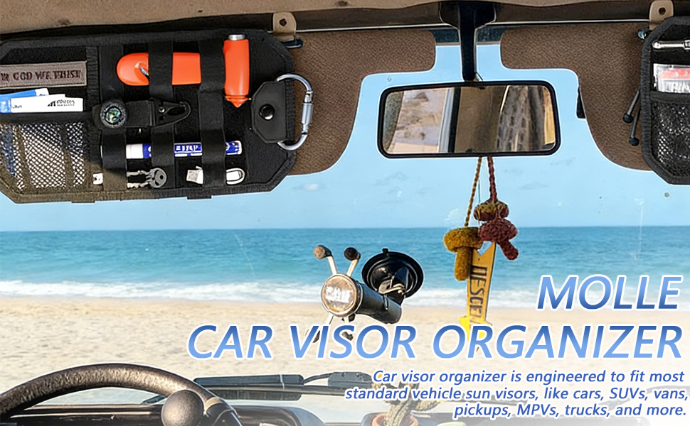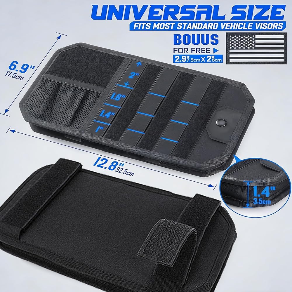 منظم حاجب الشمس للسيارة من مولي، ملحقات السيارة مع حقيبة تخزين بسحاب ومشبك نظارات وأشرطة قابلة للتعديل، لوحة مولي شبه صلبة للتروس التكتيكية، تناسب معظم المركبات وسيارات الدفع الرباعي (أسود)
