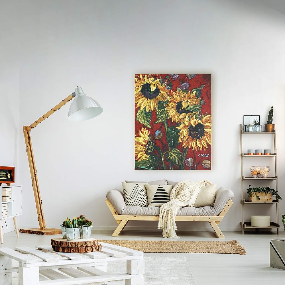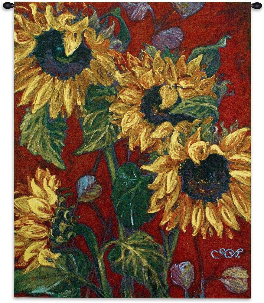 عباد الشمس على الأحمر 2 | لوحة فنية جدارية منسوجة معلقة | انفجار الأزهار من الألوان النارية | 100% قطن مقاس أمريكي 53x40