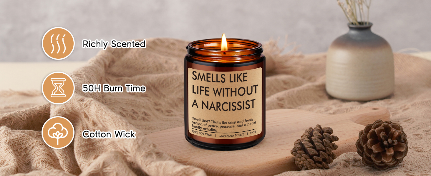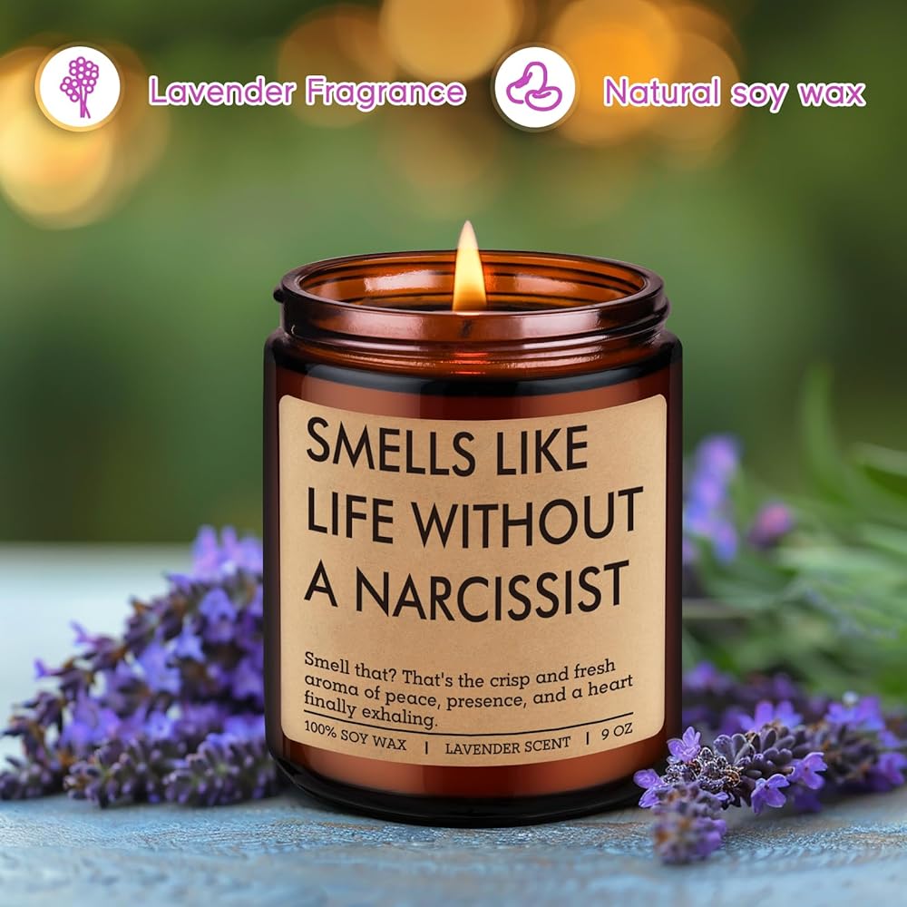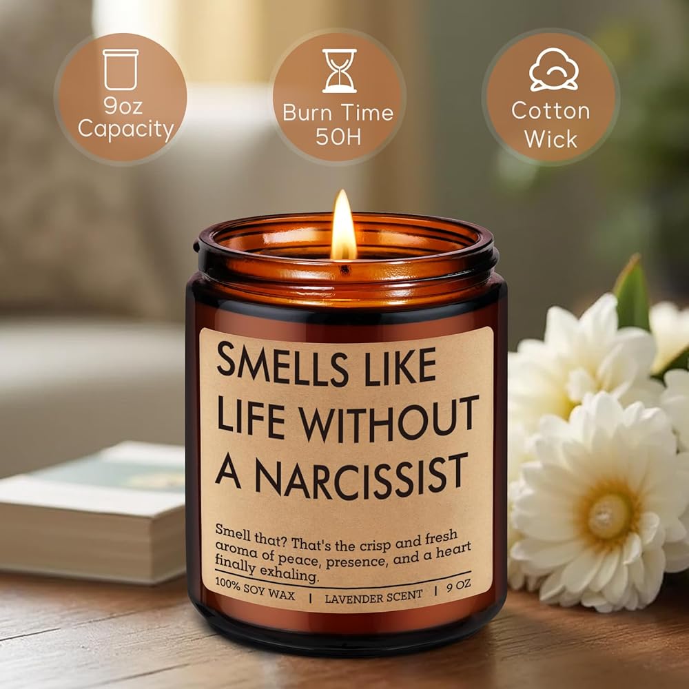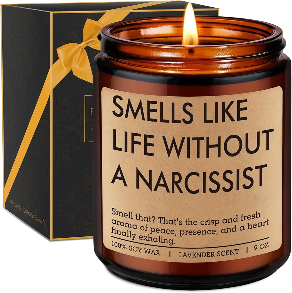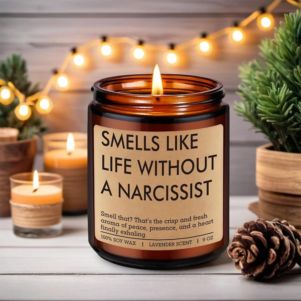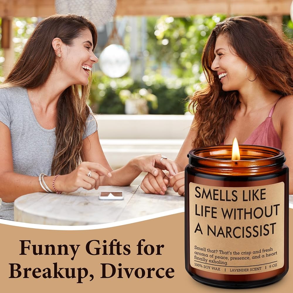 هدايا طلاق مضحكة للنساء والرجال؛ تمثل هذه الشمعة فصلاً جديدًا متحررًا بلمسة من الفكاهة؛ تتميز برسالة تمكينية "رائحة مثل الحياة بدون نرجسي. رائحة ذلك؟ هذه هي الرائحة المنعشة والمنعشة للسلام والحضور والقلب الذي يزفر أخيرًا"، إنها طريقة ممتعة ولكنها راقية للاحتفال بالبدايات الجديدة والتجديد الذاتي؛ هدايا مدروسة للمرأة المطلقة حديثًا، أو الرجل، أو الأخت المطلقة للتو، أو الصديق المفضل، أو الصديق المفضل، أو زميل العمل، أو أي شخص يمر بانفصال أو طلاق