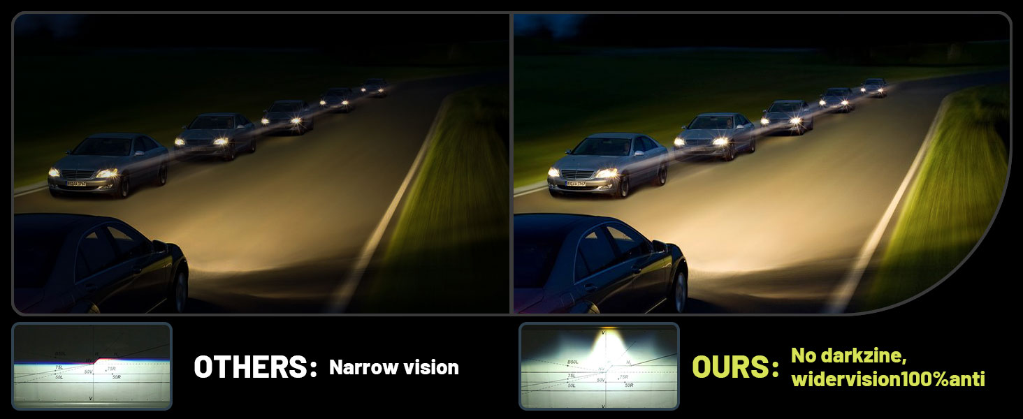 **سطوع ملحوظ**: مزود بطبقة بصرية للأشعة فوق البنفسجية لمنع اصفرار العدسة وشيخوخةها، مما يضمن رحلة واضحة ومطمئنة في الليل. متوافق تمامًا مع لوائح SAE.