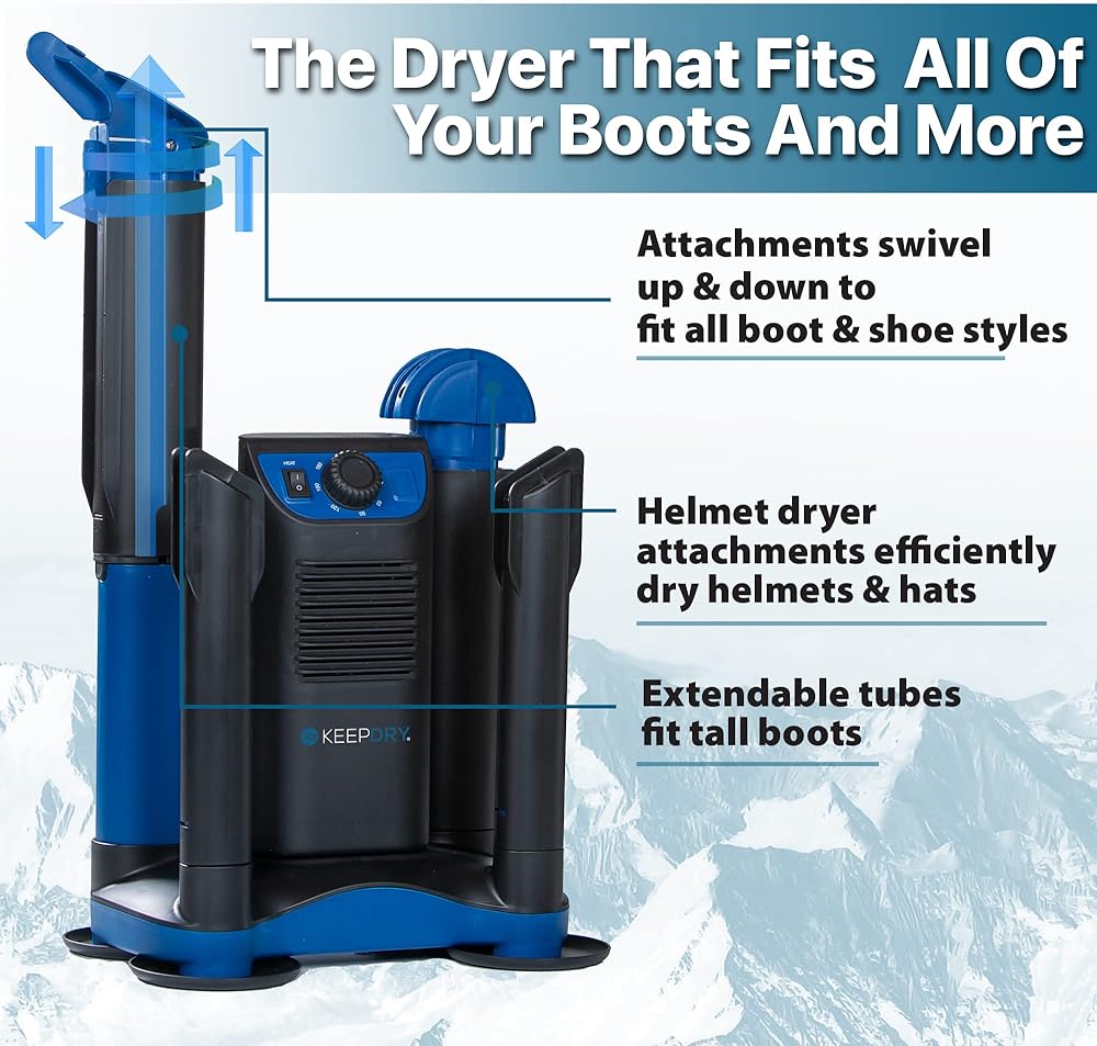 مجفف الأحذية الحراري القسري KeepDry: يوفر هواءًا دافئًا مدعومًا بالمروحة لتجفيف حذائك وأحذيتك وقفازاتك، وتجفيف زوجين في وقت واحد. مؤقت إيقاف تلقائي لمدة 3 ساعات. يشتمل على ملحقات تجفيف الخوذة.