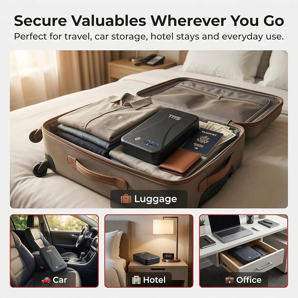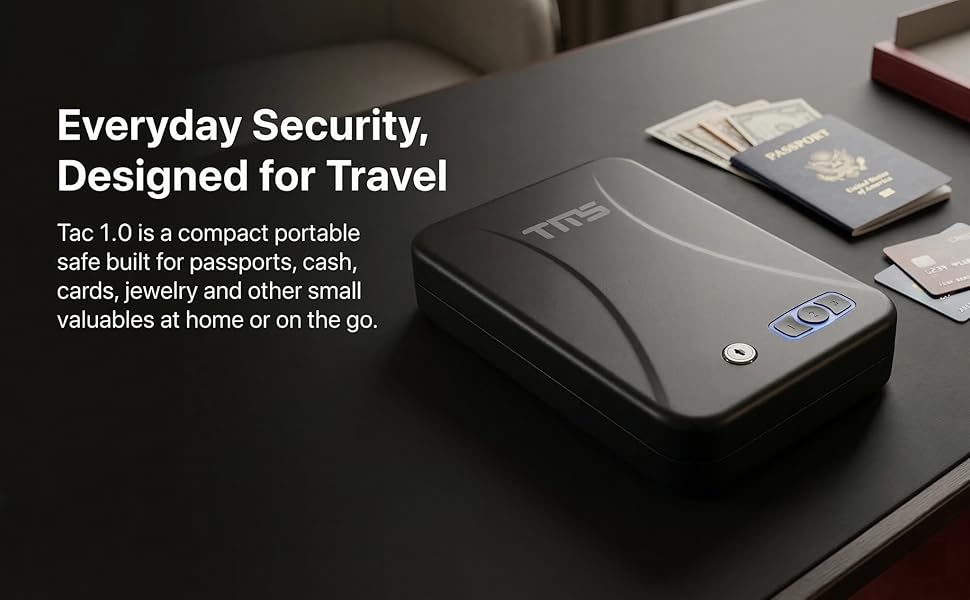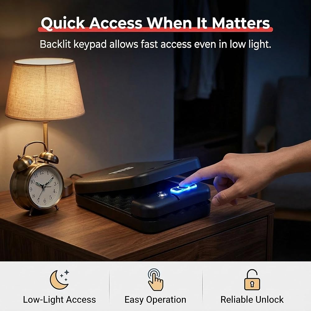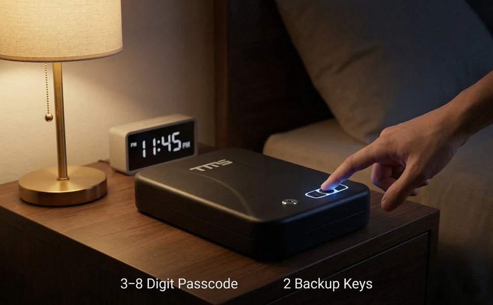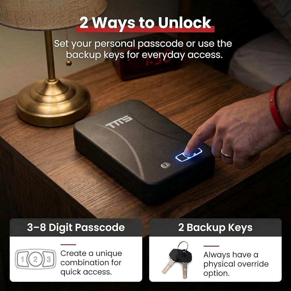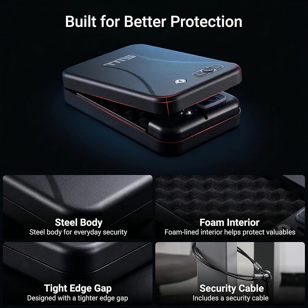 TMS مسدس محمول آمن مع لوحة مفاتيح بإضاءة خلفية، رمز مرور مكون من 3-8 أرقام ومفاتيح احتياطية، مسدس سفر آمن مع كابل أمان، صندوق قفل مسدس مدمج للسيارة، المنضدة، الفندق