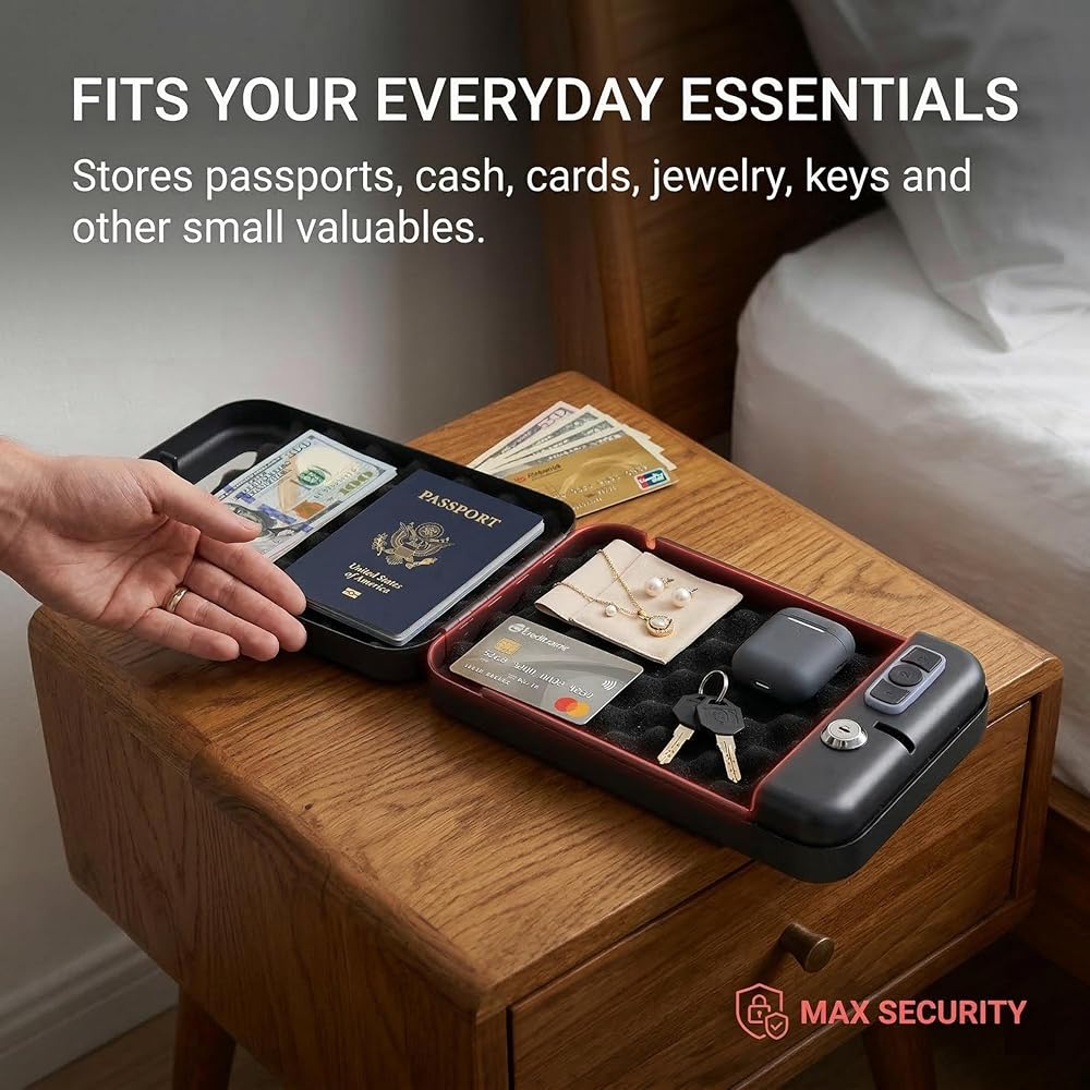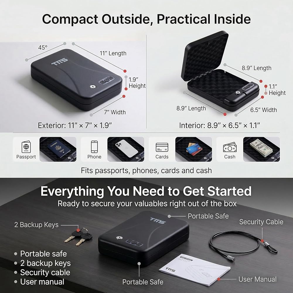 لوحة مفاتيح مكونة من 3-8 أرقام ومفاتيح احتياطية: افتح القفل باستخدام رمز المرور الشخصي الخاص بك للوصول اليومي أو استخدم المفتاحين الاحتياطيين عند الحاجة. حجم خارجي صغير وعملي من الداخل: الأبعاد الخارجية هي 11 × 7 × 1.9 بوصة، بينما يبلغ مقاس الجزء الداخلي 8.9 × 6.5 × 1.1 بوصة للتخزين المدمج. يناسب الأساسيات اليومية: مصمم لتخزين جوازات السفر والنقود والبطاقات والمجوهرات والمفاتيح وغيرها من الأشياء الثمينة الصغيرة في المنزل أو أثناء التنقل. مصمم لحماية أفضل: يساعد الجسم الفولاذي والجزء الداخلي المبطن بالرغوة وفجوة الحافة الأكثر إحكامًا على توفير أمان يومي يمكن الاعتماد عليه. جاهز للسفر والفندق والاستخدام بجانب السرير: سهل وضعه في الأمتعة أو الأدراج أو غرف الفنادق أو على المنضدة، مع كابل أمان متضمن لمزيد من المرونة.