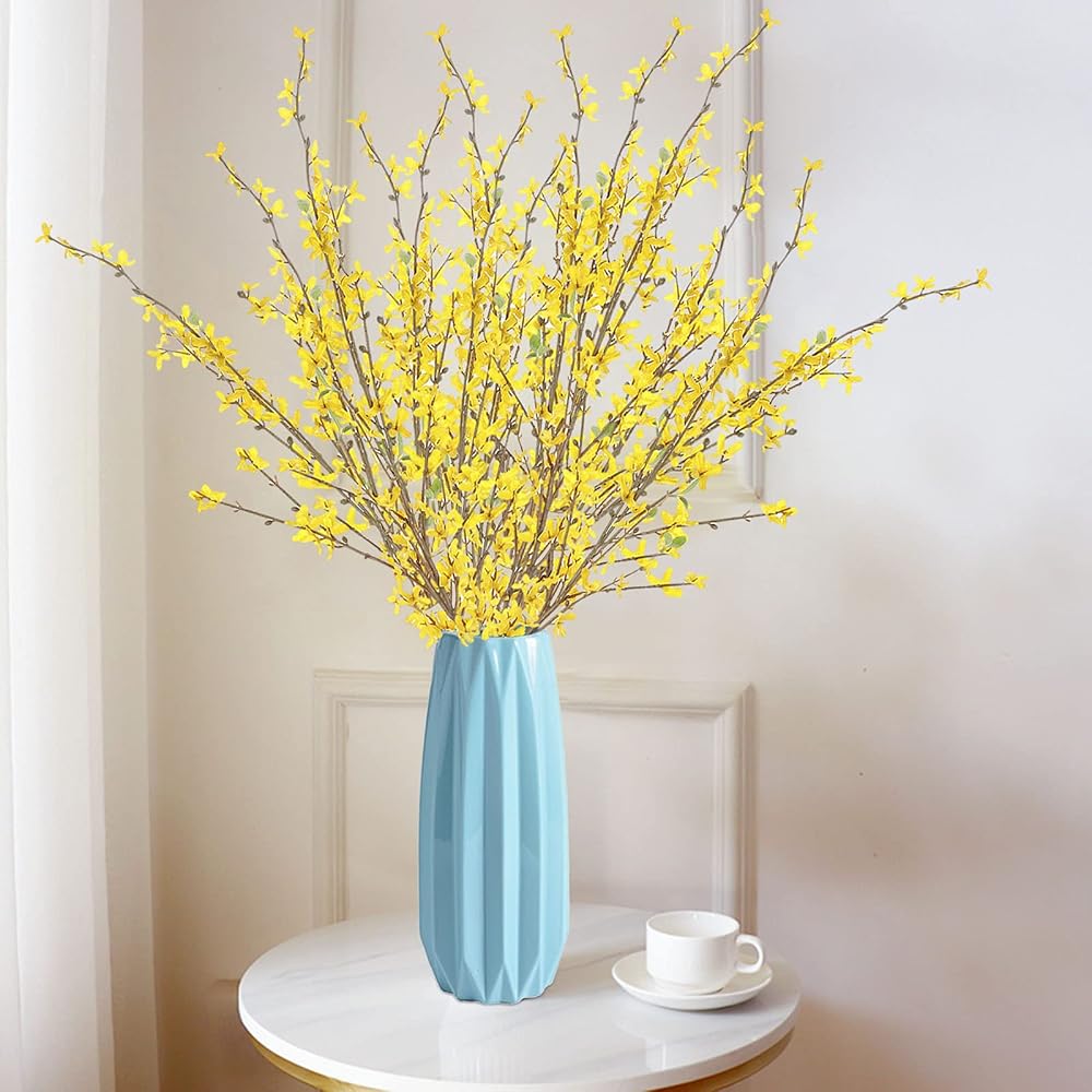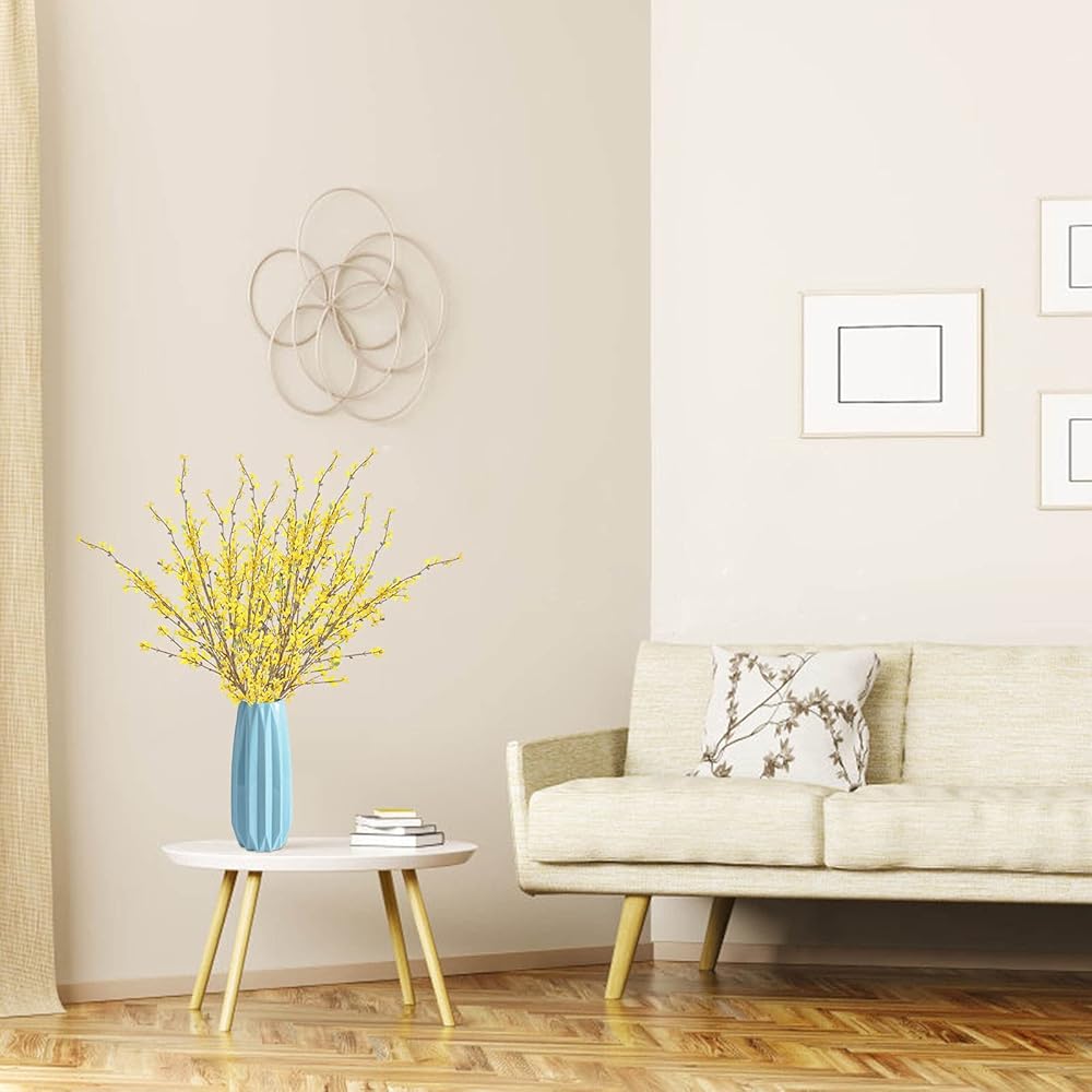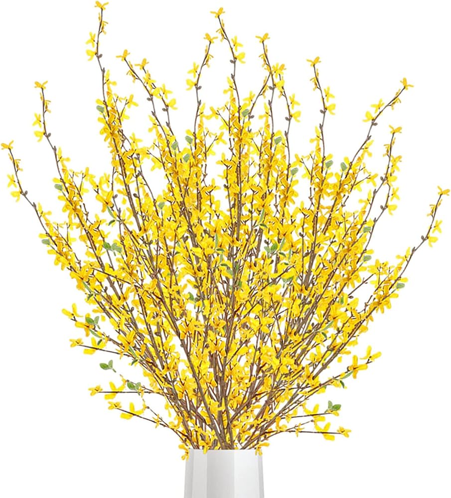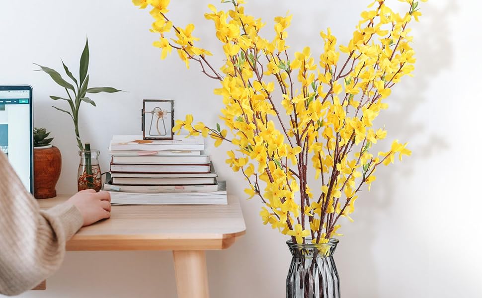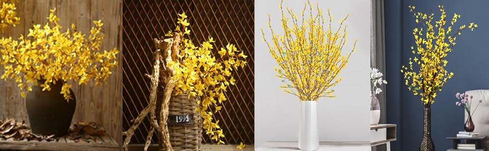• خامة عالية الجودة: زهور فورسيثيا الصناعية للزينة مصنوعة من الحرير. يتم استخدام الأسلاك المغلفة بالبلاستيك للثبات. السيقان قابلة للتعديل ويمكنك قصها أو ثنيها