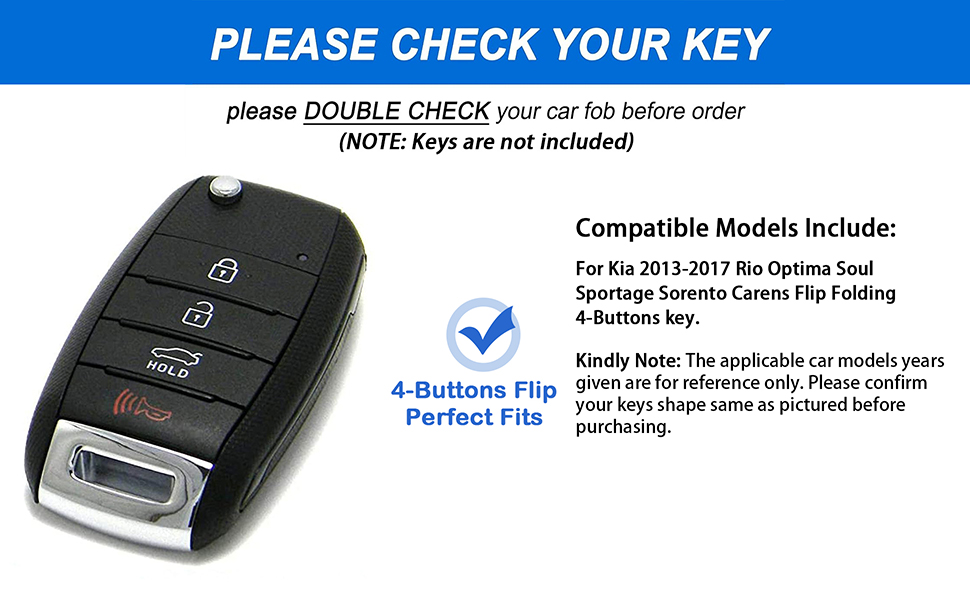 • 1. [الموديلات المناسبة] - مصممة خصيصًا لسيارة كيا 2013-2017 ريو أوبتيما سول سبورتاج سورينتو كارينز قابلة للطي بمفتاح 4 أزرار. قبل الشراء، يرجى التحقق مرة أخرى من شكل سلسلة مفاتيحك من خلال الرجوع إلى الصورة الثانية. أرسل لنا الصور الرئيسية إذا لم تكن متأكدًا، وسنساعدك