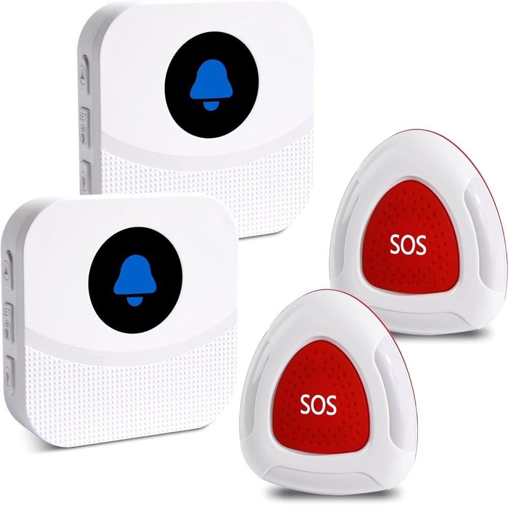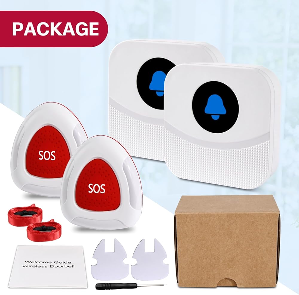 نظام استدعاء الممرضات اللاسلكي، 2 زر قلادة SOS و2 جهاز استقبال إضافي، نطاق طويل 500 قدم للمنزل وكبار السن والمريض ومقدمي الرعاية مع 55 نغمة رنين وتنبيه بصوت عالٍ 110 ديسيبل