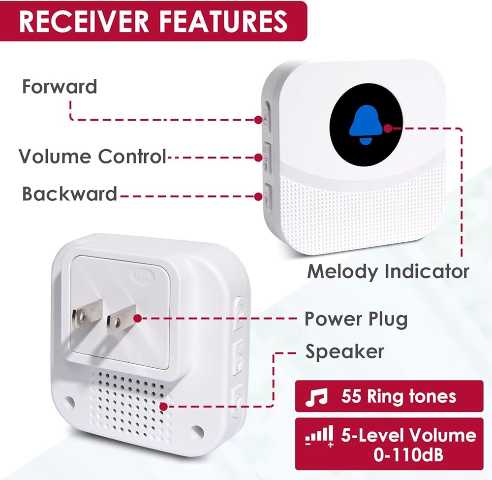 【55 نغمة رنين وتنبيه بصوت عالٍ 110 ديسيبل حتى لا تفوت أي مكالمة أبدًا】 لا تفوت أي تنبيه مرة أخرى! يتميز نظام استدعاء الممرضات لدينا بـ 55 نغمة رنين مميزة للتمييز بين المكالمات أو تجنب الخلط مع الأصوات الأخرى. مع 5 مستويات صوت قابلة للتعديل تصل إلى 110 ديسيبل قوي، يمكن لجهاز الاستقبال إنتاج إنذار عالٍ وواضح يقطع الضوضاء المنزلية، مما يضمن الاستجابة السريعة.