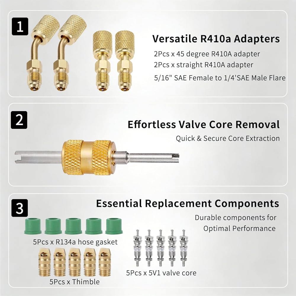 • Package Include: 2Pcs x 45 degree R410a adapter, 2Pcs x straight R410a adapter, 1Pcs x Valve Core Remover, 5Pcs x R134a hose gaskets, 5Pcs x 5V1 valve core, 5Pcs x Thimble. If you have any problem, please feel free to contact us, we will solve it and provide you with the best after-sales service.