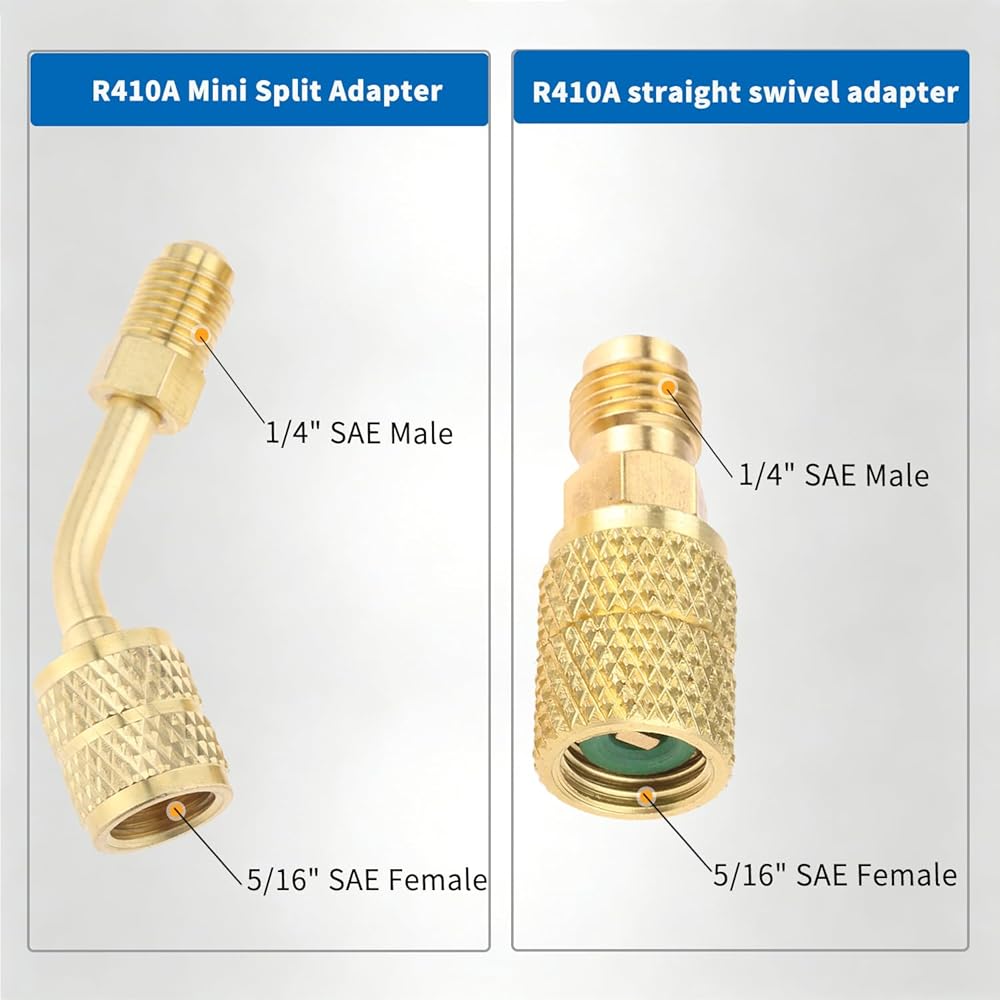 • 45-Degree & Straight Adapters for Easy Access: The kit includes both 45-degree and straight R410a adapters. The angled design offers easier access to tight service ports on mini-split units, This versatility makes it the ideal mini split adapter for confined spaces.