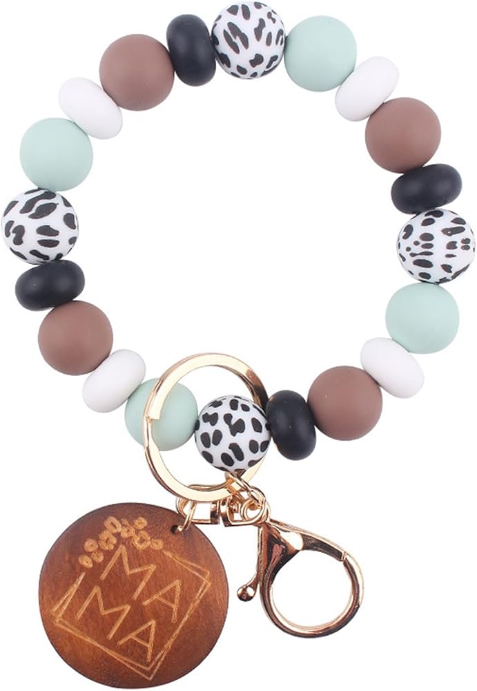 Elevate your accessory game with this vibrant and playful silicone bead keychain wristlet bracelet. Crafted with a mix of colorful beads in pink, red, yellow, blue, and black and white dalmatian print accents, this bracelet adds a touch of fun and personality to your everyday look. The stretchy, flexible design allows for a comfortable fit on your wrist or as a keychain. A wooden charm engraved with 'MAMA' adds a heartwarming touch, making it a thoughtful gift for mothers. Lightweight and durable, this bracelet is perfect for on-the-go convenience, ensuring your keys are always within reach. Embrace your unique style and show your love for mom with this eye-catching accessory.