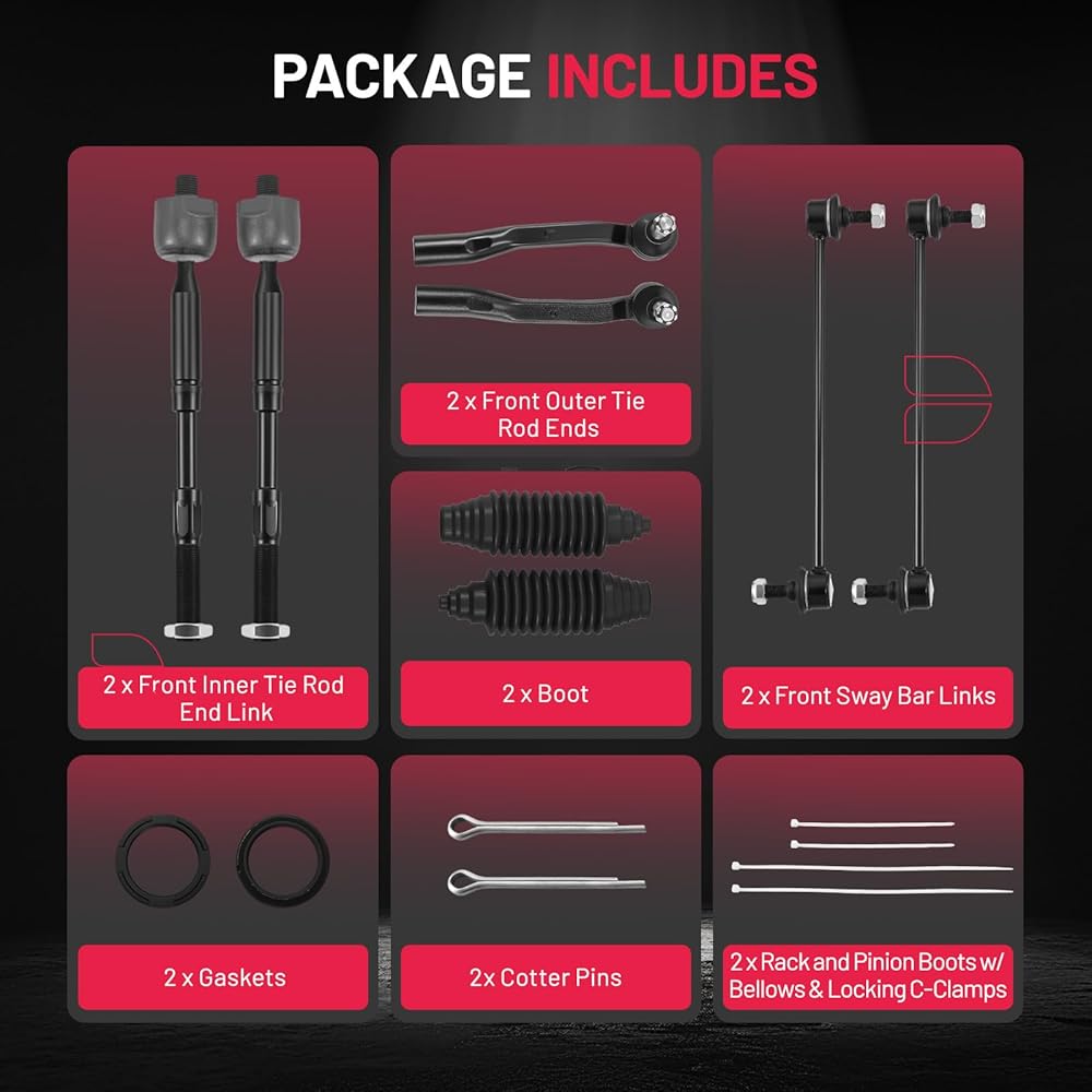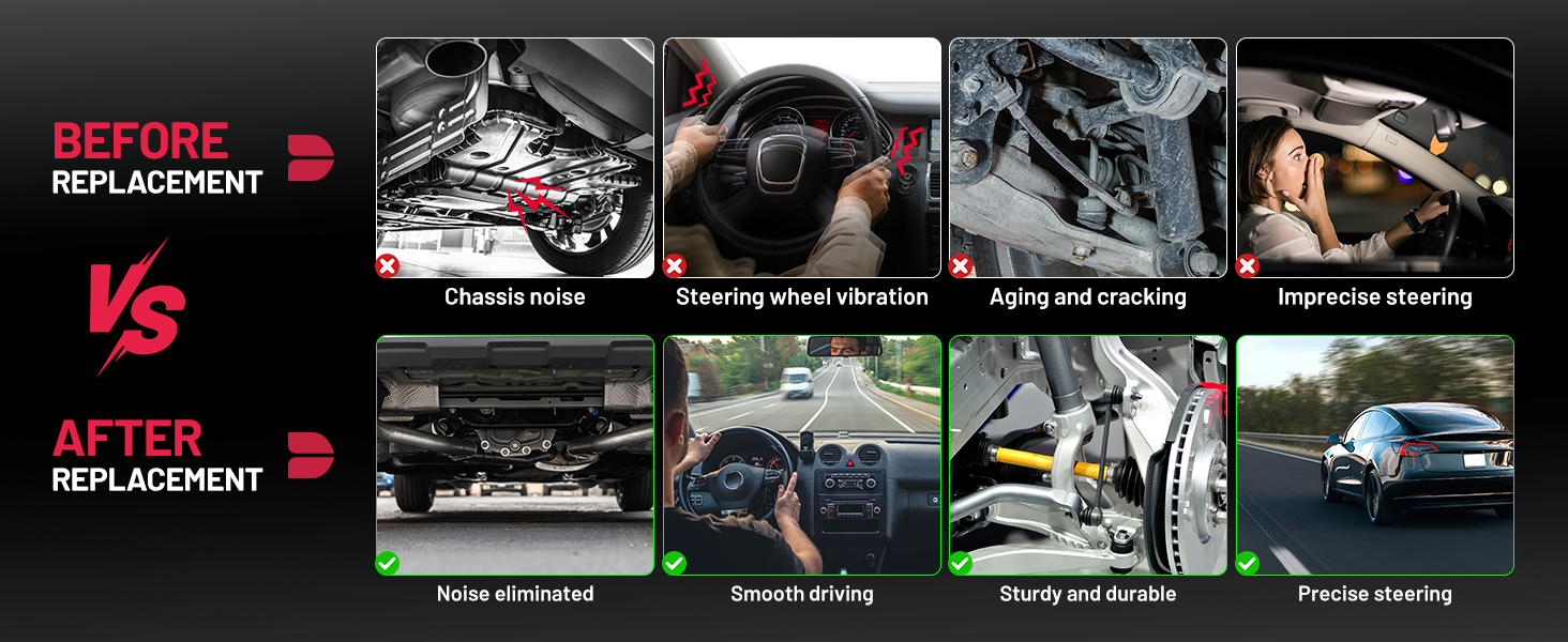 إصلاح مشكلات التوجيه وتحسين راحة القيادة - مثالي لقضبان الربط الداخلية/الخارجية والمفاصل الكروية البالية أو الفضفاضة؛ يساعد على تصحيح اهتزاز التوجيه، والاستجابة غير المتقنة، والتعامل غير المتساوي، والضوضاء الخشخشة، والتعليق البالي، واستعادة القيادة الأكثر سلاسة وأمانًا.