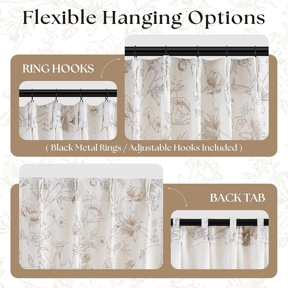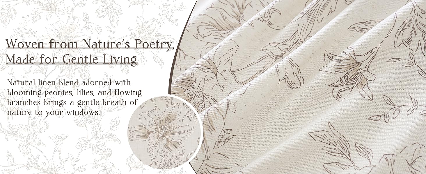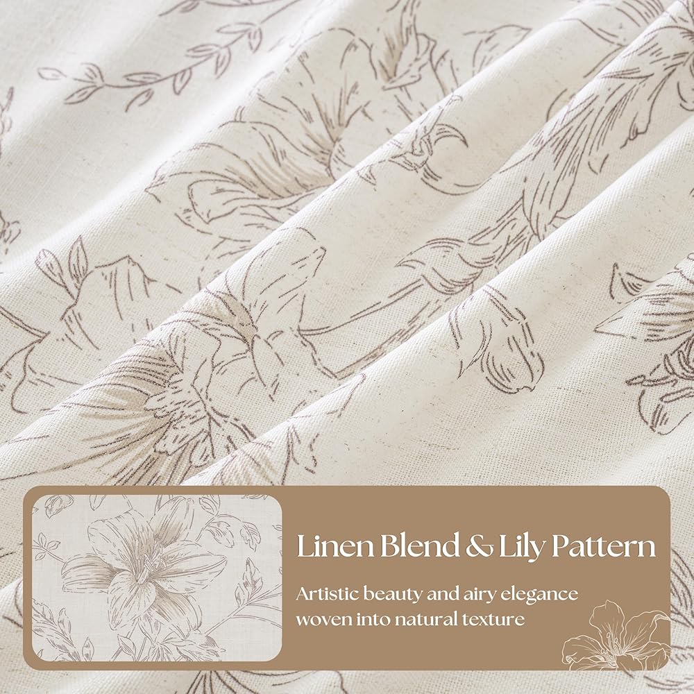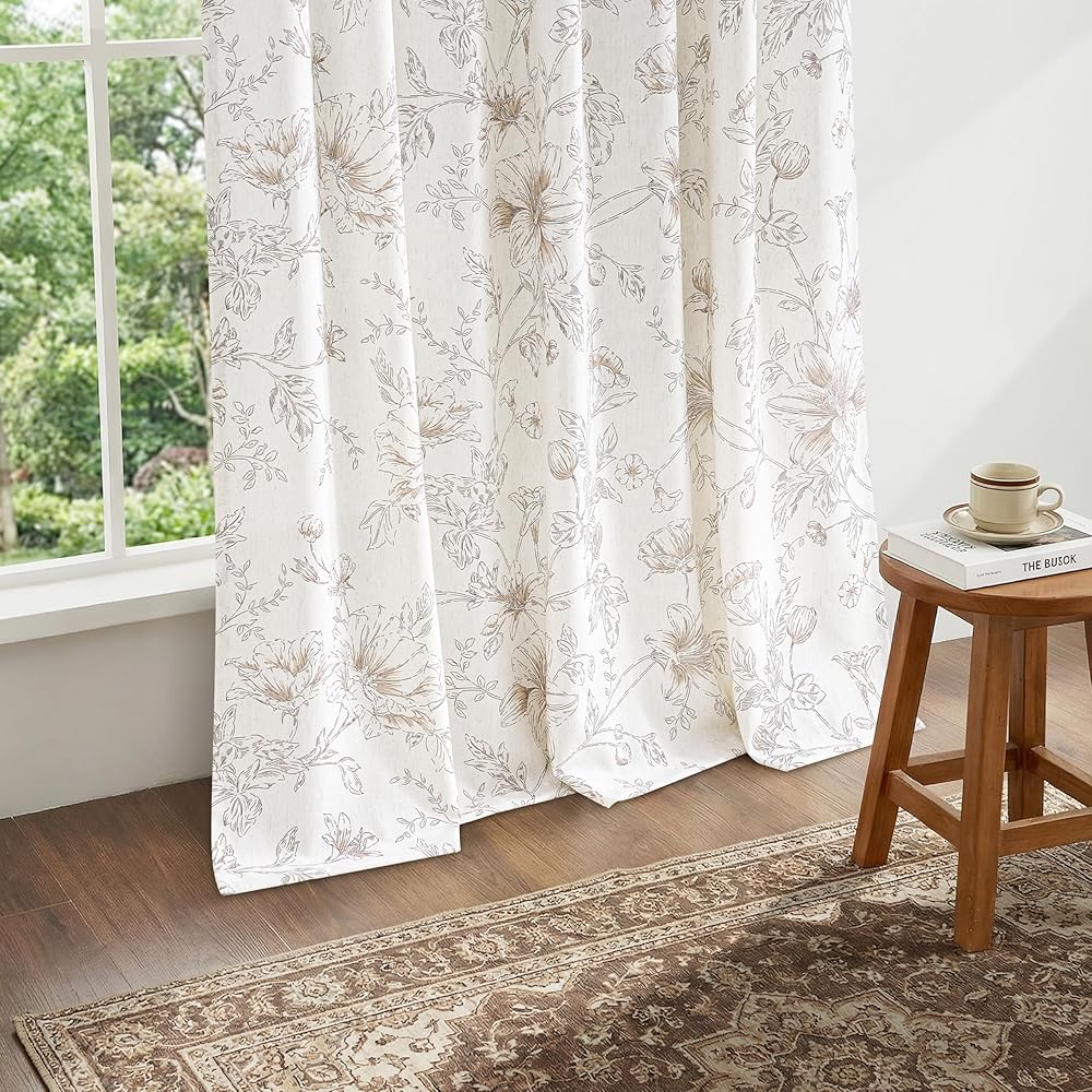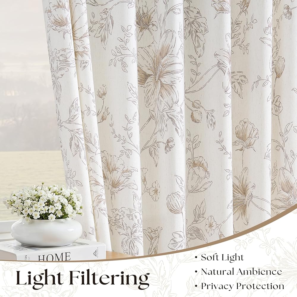 تصميم الأزهار الرقيقة: تتميز ستائرنا الزهرية الكتانية بتصميم بسيط ولكنه متطور يضفي أجواءً رائعة على منزلك. تم تزيين قماش الكتان برسومات نباتية بنية فاتحة تصور الزهور والبراعم وأوراق الشجر المتفتحة. النمط المعقد يكمل ديكور المزرعة أو الريفي أو الأنيق أو الحديث أو البوهيمي مع إضافة العمق