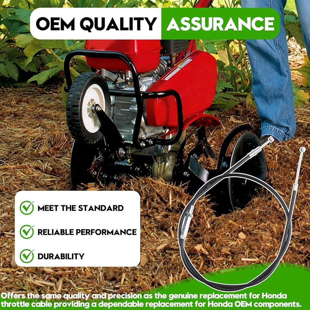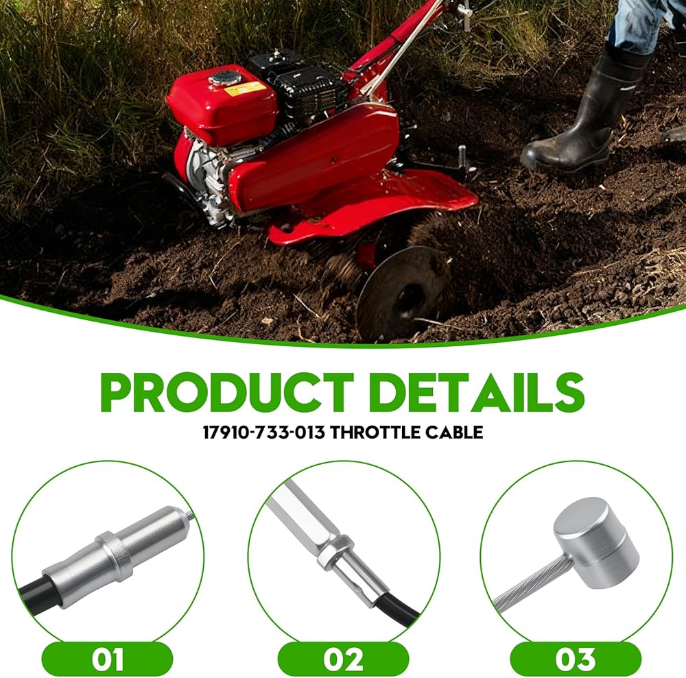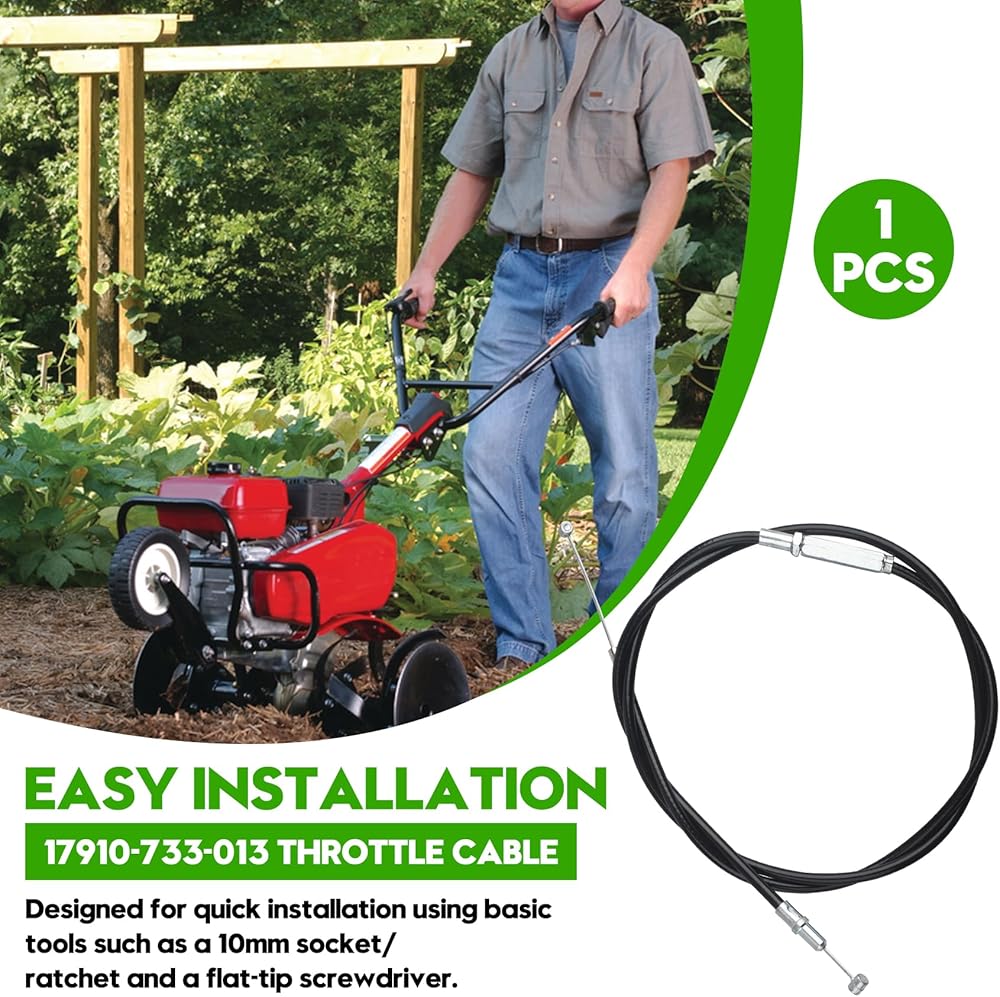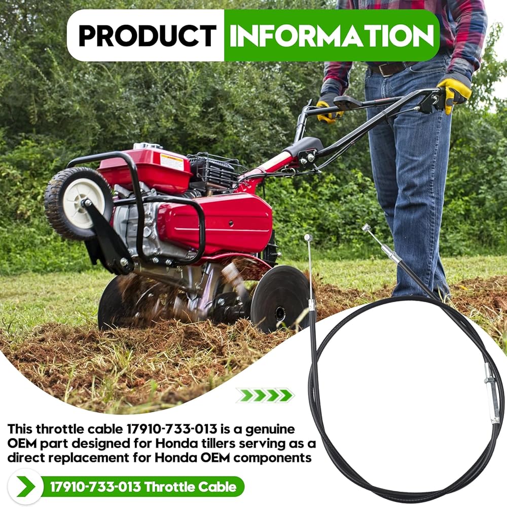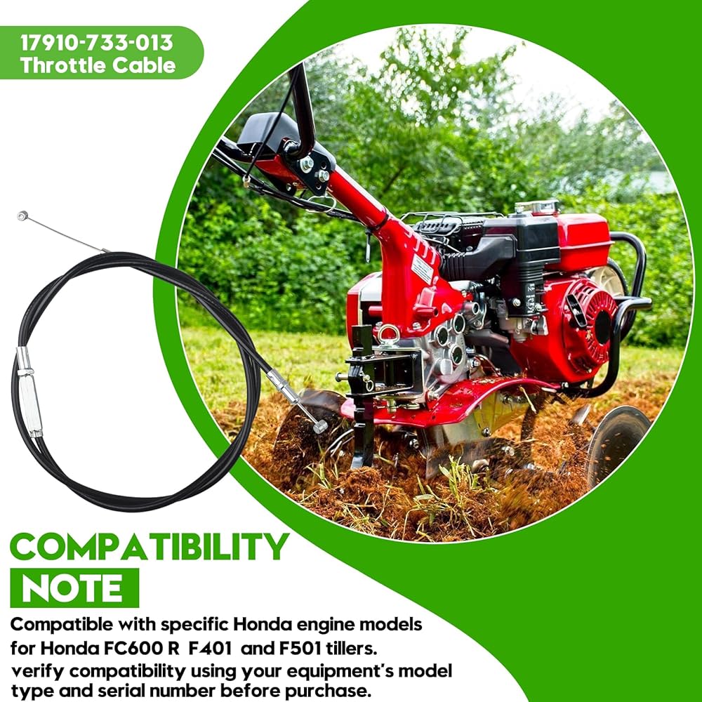 Product Information: This throttle cable 17910-733-013 is a genuine OEM part designed for Honda tillers, serving as a direct replacement for Honda OEM components. It ensures a perfect fit for models like the Honda FC600 R, F401, and F501 tillers, restoring normal throttle control operation after installation. Compatibility Note:Compatible with specific Honda engine models, for Honda FC600 R, F401, and F501 tillers. This replacement for Honda OEM parts, verify compatibility using your equipment's model, type, and serial number before purchase. OEM Quality Assurance: Manufactured to meet original equipment standards, ensuring reliable performance and durability. Offers the same quality and precision as the genuine replacement for Honda throttle cable, providing a dependable replacement for Honda OEM components. Easy Installation:Designed for quick installation, using basic tools such as a 10mm socket/ratchet and a flat-tip screwdriver. No specialized tools or modifications are required, making it ideal for efficient maintenance. Usage Guidance:To ensure proper function, confirm your equipment's model (e.g., FC600 R, F401, F501) matches this product's compatible models before installation. This replacement for Honda OEM parts is tailored for specific tiller systems and delivers seamless integration.