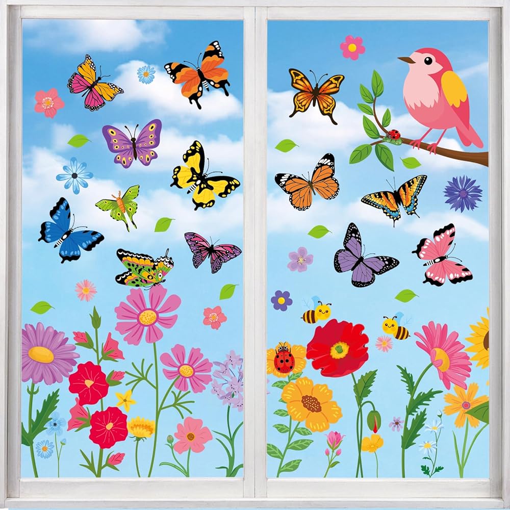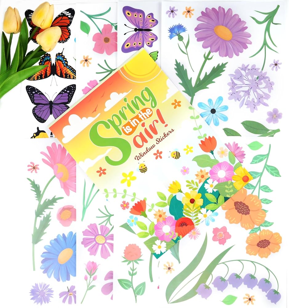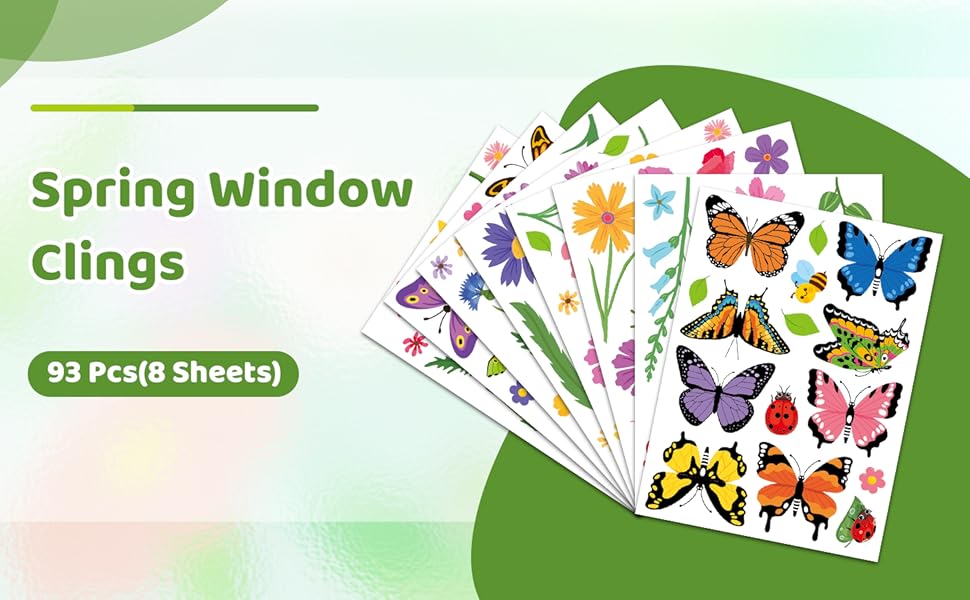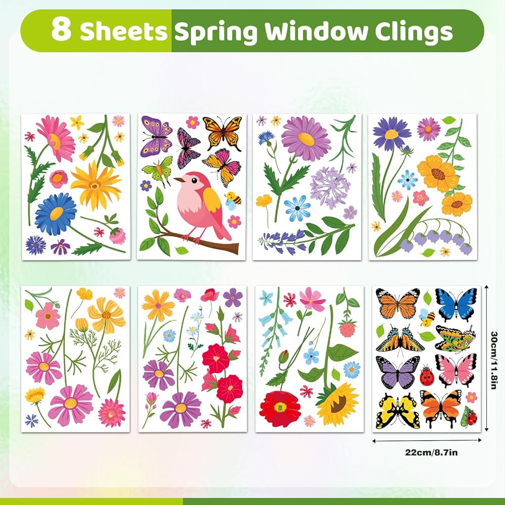 ملصقات النوافذ الزنبركية: 93 قطعة في 8 أوراق. تتميز بالفراشات والنحل والطيور والزهور، مما يجعلها مثالية لإضافة لمسة ربيعية مبهجة