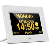 7 inch Digital Calendar Day Clock for Seniors & Elderly, Extra Large Display with Non-Abbreviated Day Date & Month, Dementia Alarm Clock for Memory Loss, Auto-Dimming, White